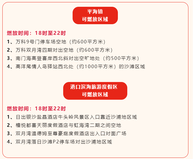 (一)平海鎮(zhèn)劃定萬科9號(hào)門停車場空地(約600平方米);萬科雙月灣四期對(duì)出空地(約600平方米);南門海高登喜岸西北斜對(duì)出空曠地處(約500平方米);高洋尾情人島驛站西北處(約1000平方米)沙灘區(qū)域?yàn)橄迺r(shí)可燃放區(qū),將18時(shí)至22時(shí)規(guī)定為可燃放時(shí)間(紅色區(qū)域?yàn)榻挤秶?