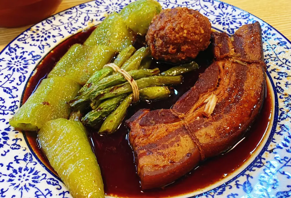 甏肉干飯起源于元朝,隨著京杭大運(yùn)河的開通,南方大米北運(yùn),濟(jì)寧人將用陶器燉出的肉與大米飯搭配,逐漸發(fā)展成今日的甏肉干飯。甏肉色澤紅潤,質(zhì)地柔嫩,肥而不膩,爛而不糜,搭配咸菜、老虎菜或腌制辣椒,味道更佳。