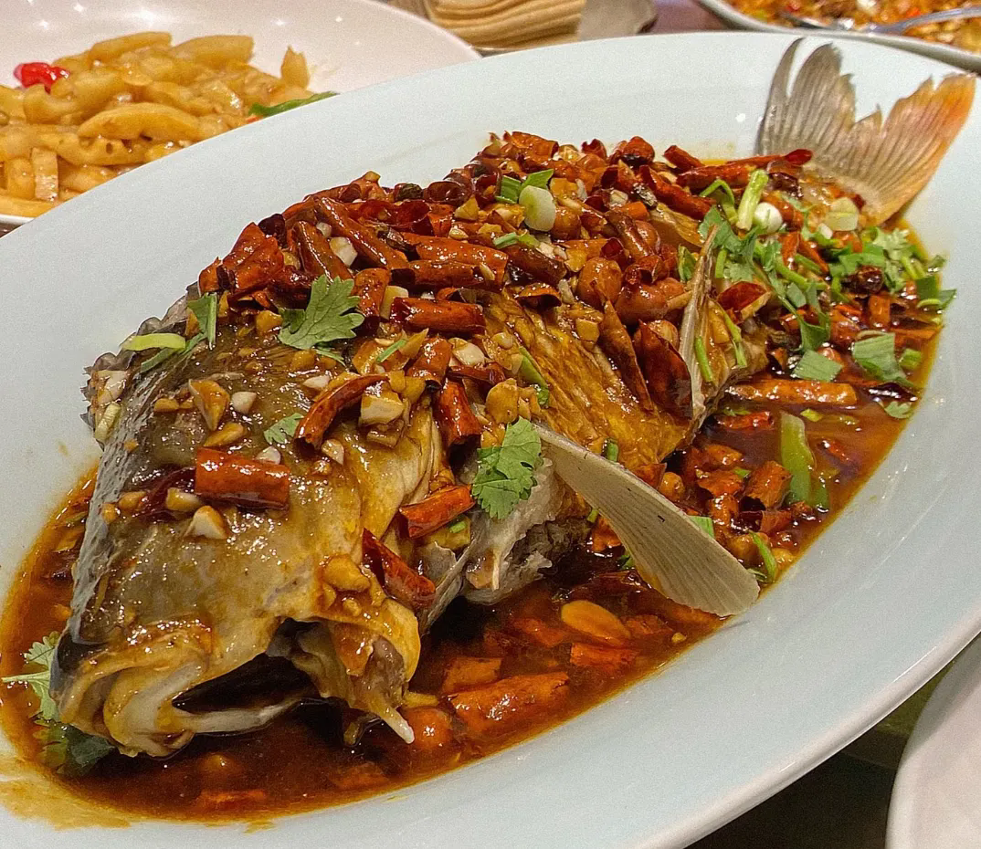 微山湖香辣鯉魚選用微山湖特產(chǎn)鮮活的四鼻鯉魚為原料,去鱗、內(nèi)臟后剞上一字花刀,投入燒開烹好的魚湯中,燉熟,調(diào)味盛入魚盤中,然后把干辣椒、花生米拍碎,加芝麻油炸后,澆在燉好的鯉魚上。剎那間,魚的鮮味、芝麻的香味、混合著干辣椒的辣味撲鼻而來,直擊味蕾,令人垂涎欲滴。