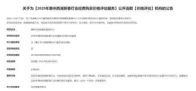 發(fā)布《關(guān)于為【2025年惠州西湖新春燈會(huì)經(jīng)費(fèi)購(gòu)買價(jià)格評(píng)估服務(wù)】