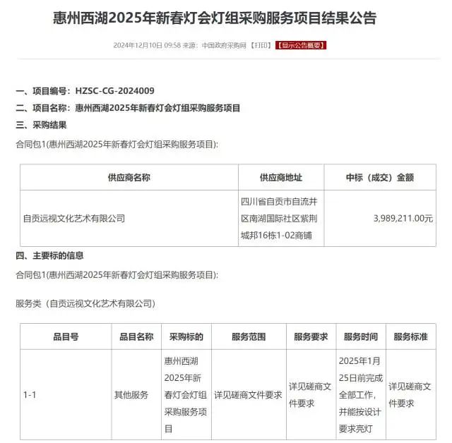 2024年新春,農(nóng)歷臘月二十八日(2024年2月7日)西湖花燈亮燈閃耀全城。2025年新春花燈又將何時(shí)點(diǎn)亮?據(jù)中國(guó)政府采購(gòu)網(wǎng)發(fā)布的最新信息顯示,當(dāng)前,自貢遠(yuǎn)視文化藝術(shù)有限公司已正式以3989211元的價(jià)格成功中標(biāo)惠州西湖2025年新春燈會(huì)燈組采購(gòu)服務(wù)項(xiàng)目,合同約定在2025年1月25日前完成全部工作,并能按設(shè)計(jì)要求亮燈。