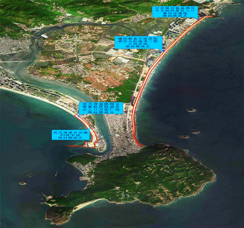 (二)港口濱海旅游度假區(qū)劃定東山海和沙咀尾靠近沙灘沙浦地附近劃定4個空曠沙灘區(qū)域(日出銀沙鹽晶酒店牛頭嶺風景區(qū)入口靠近沙浦地區(qū)域;檀悅都喜天麗度假酒店與虹海灣二期之間空地;雙月灣溫德姆至尊豪庭度假酒店出入口對面廣場;雙月灣落日沙灘P2停車場對出沙浦地區(qū)域)定為限時可燃放區(qū),將18時至22時規(guī)定為可燃放時間(紅色區(qū)域為禁燃范圍)。