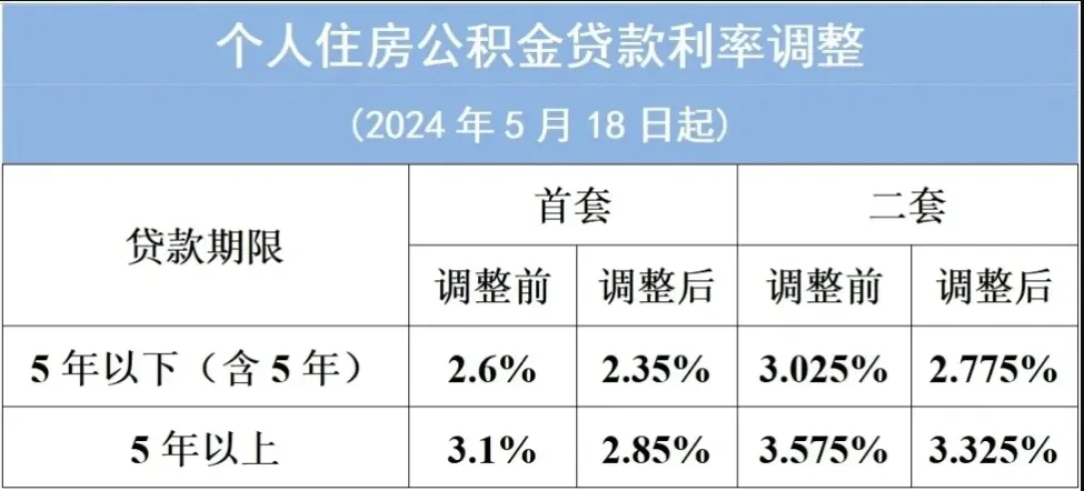 根據(jù)《中國人民銀行關(guān)于下調(diào)個人住房公積金貸款利率的通知》,市公積金中心自2024年5月18日起,下調(diào)個人住房公積金貸款利率0.25個百分點,即調(diào)整如下: