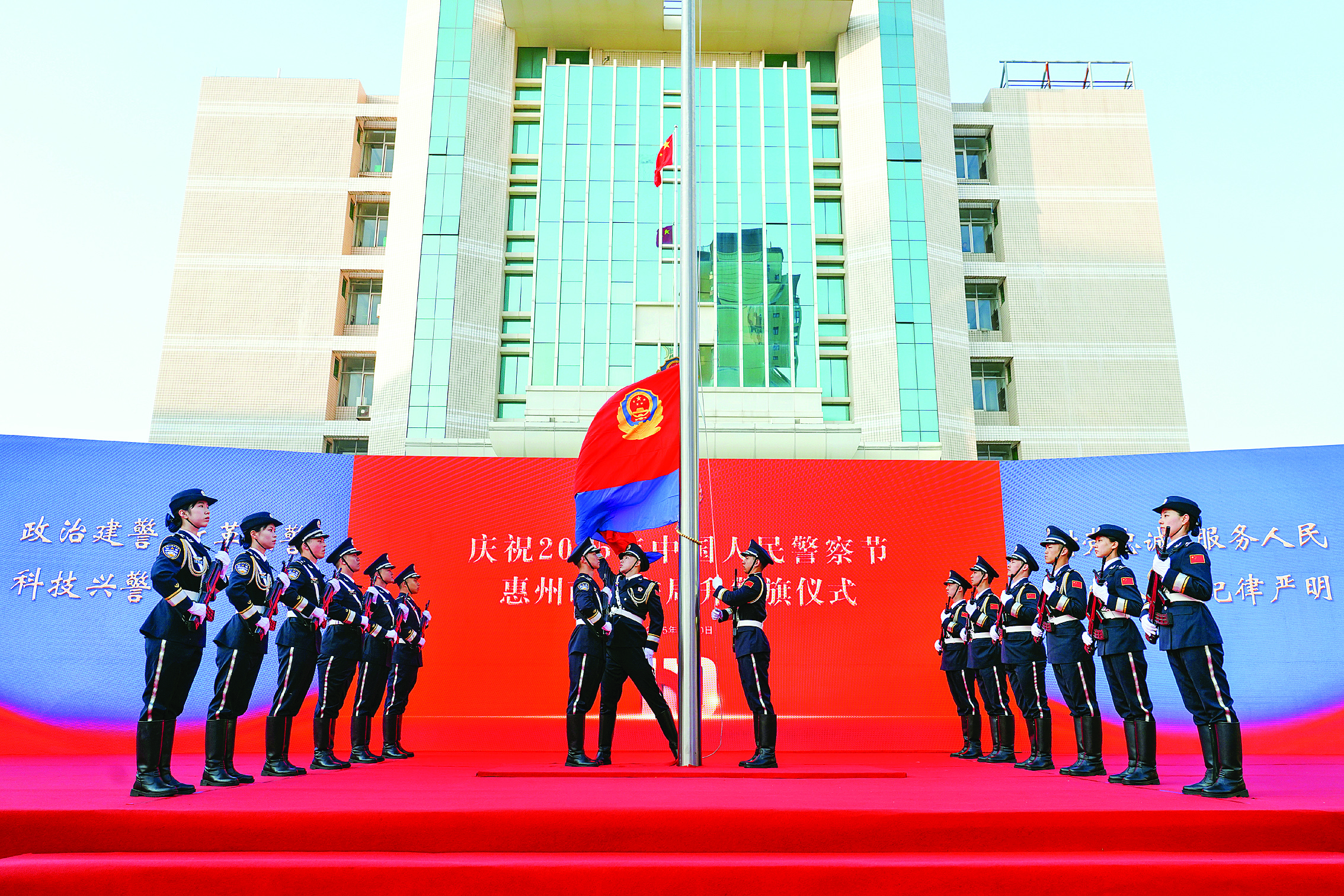 惠州市公安局在警訓(xùn)處舉行慶祝2025年中國人民警察節(jié)升警旗儀式。