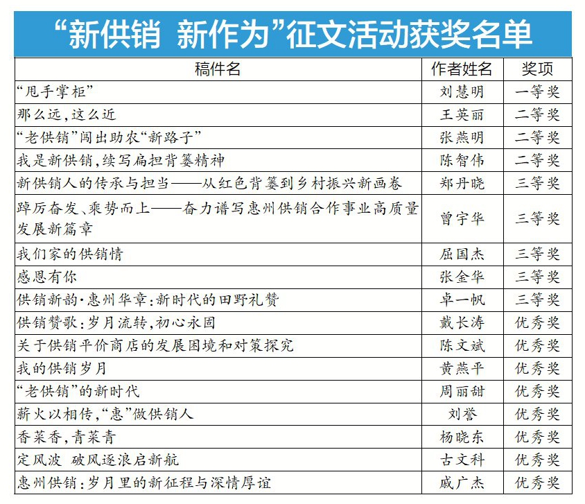 惠州日報訊 (記者劉建威 通訊員郭權(quán))由惠州市供銷合作聯(lián)社舉辦的“新供銷 新作為”第二屆供銷主題征文活動獲獎名單正式出爐。本次共評出一等獎1名、二等獎3名、三等獎5名、優(yōu)秀獎8名,獲獎作品將擇優(yōu)在《惠州日報》、今日惠州網(wǎng)展示。