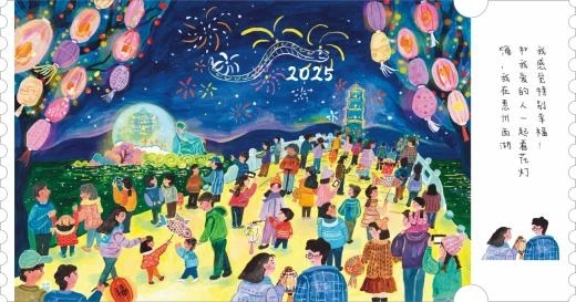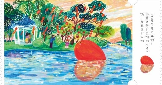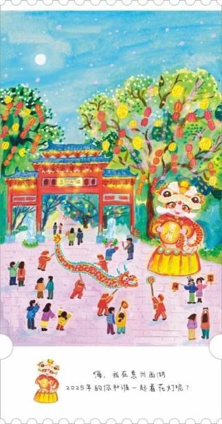正面:惠州西湖,新春燈會(huì)璀璨奪目。門樓熠熠生輝,象征著新年的紅火與吉祥。金蛇舞獅靈動(dòng),為新年祈福,為人們帶來(lái)好運(yùn)。人群熙攘笑開(kāi)顏,共賞明月映湖、亭臺(tái)樓閣,嶺南風(fēng)情盡顯,“不辭長(zhǎng)作嶺南人”,盡顯西湖獨(dú)特韻味。