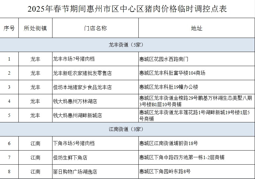 “各調(diào)控點(diǎn)將會在顯著位置懸掛‘2025年春節(jié)期間政府價格惠民豬肉調(diào)控點(diǎn)’橫幅以及張貼‘政府價格惠民豬肉調(diào)控價目表’!笔邪l(fā)展和改革局相關(guān)負(fù)責(zé)人介紹,本次共計(jì)51個調(diào)控點(diǎn),由惠州市肉聯(lián)廠有限公司、惠州市天虹商場有限公司、惠州市麗日購物廣場有限公司、惠州市佳坊農(nóng)產(chǎn)品有限公司、惠州市悅品尚商業(yè)有限公司、深圳市錢大媽農(nóng)產(chǎn)品有限公司等企業(yè)承擔(dān)政府調(diào)控豬肉具體銷售工作。