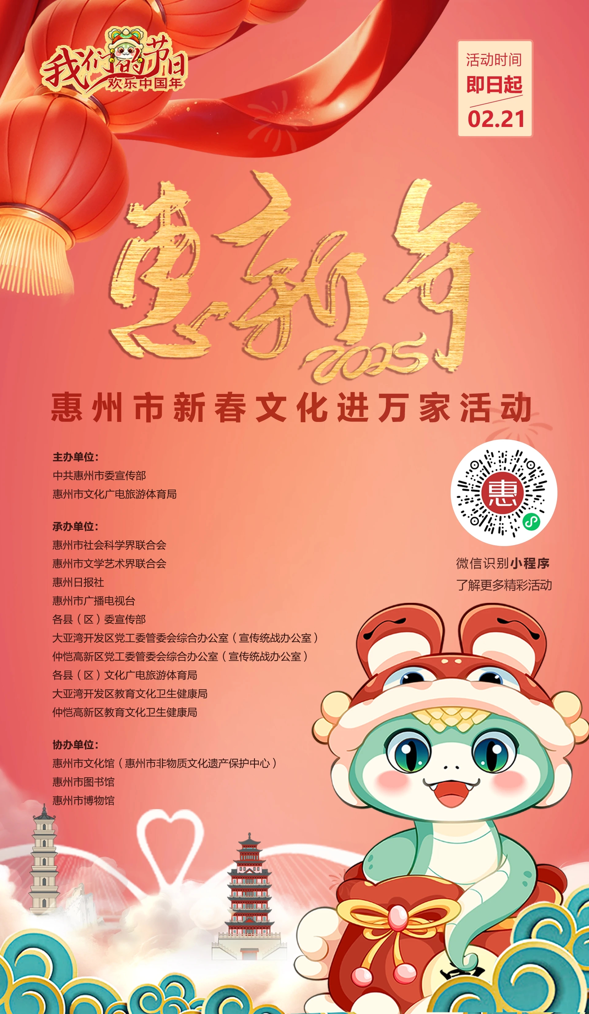 本次活動由中共惠州市委宣傳部、惠州市文化廣電旅游體育局主辦,旨在積極推動文化傳承發(fā)展和繁榮興盛,深入實施2025年“我們的中國夢——文化進萬家”活動,以形式多樣的文化活動營造歡樂吉祥、溫暖和順的濃厚節(jié)日氛圍。