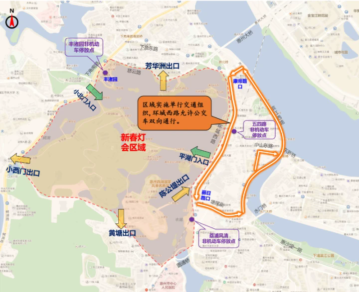 1月22日,惠州市公安局交警支隊(duì)發(fā)布《關(guān)于2025年西湖新春燈會期間實(shí)施臨時交通管制的通告》。1月26日至2月12日(18天)每晚19:30至22:30,惠州西湖景區(qū)周邊環(huán)城西路、塘尾街、水門路、環(huán)城東路等路段將實(shí)施臨時交通管制措施。每日18:00至23:00,在西湖景區(qū)周邊道路開設(shè)接駁公交車環(huán)線,游園觀燈的游客可在沿途各站點(diǎn)免費(fèi)乘坐接駁公交車。