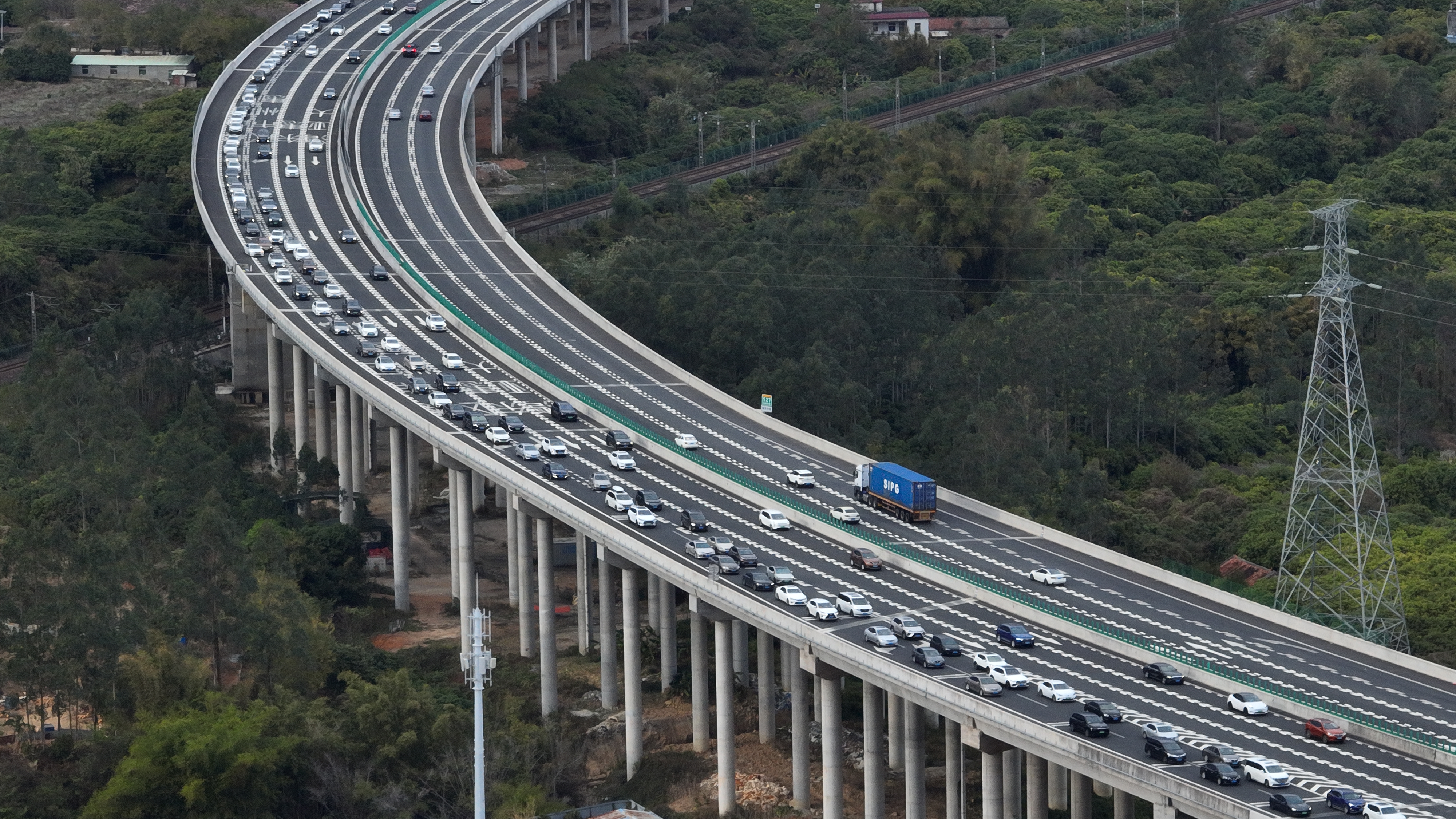 2月3日下午,惠河高速與韶惠高速象頭山立交附近路段返程車流量較大。 惠州日報記者李松權(quán) 攝