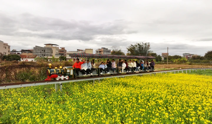 游客坐上小火車穿行在油菜花海中,感受春光燦爛。