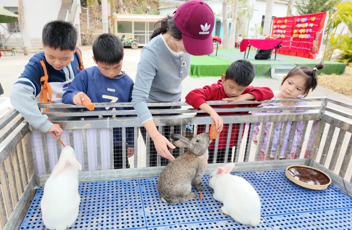 游客在共聯(lián)村一生態(tài)園投喂兔子,近距離感受動物的溫存。