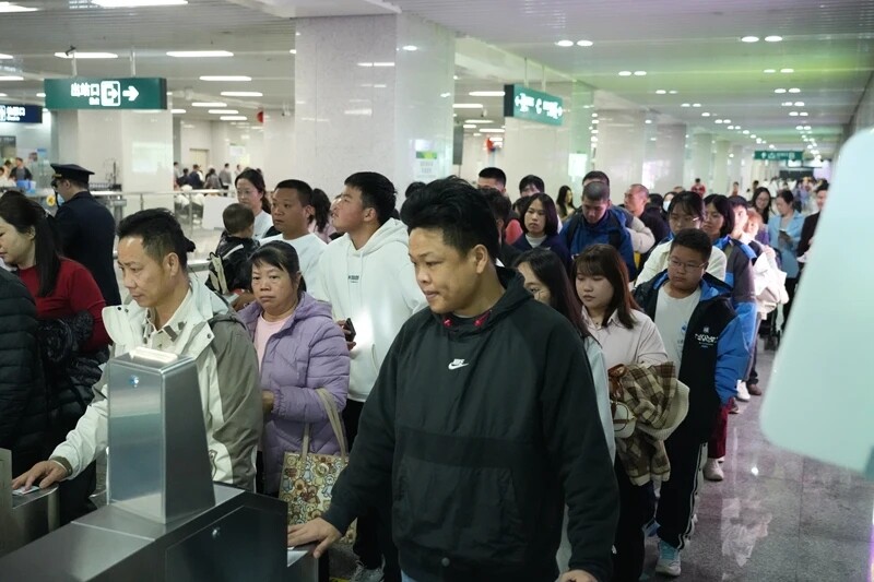 大年初三,廣惠城際西湖東站進(jìn)出站迎客流量高峰;輬笕襟w記者朱金贊 攝