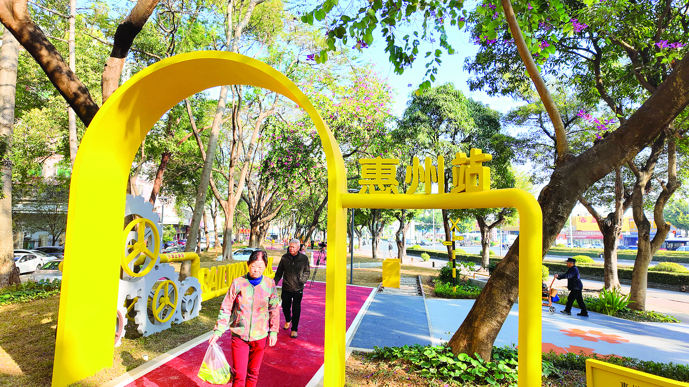 淺灰色與黃色線條融合的“站牌”寫著“惠州站:惠州—北京”,大片紅色地板里有“快速列車”等字樣,淺灰色的“鐵軌”、嬌嫩的綠草,還有不少健身器材……走進(jìn)惠州大道旁的口袋公園——時輪園,仿佛置身于一個“軌道樂園”。