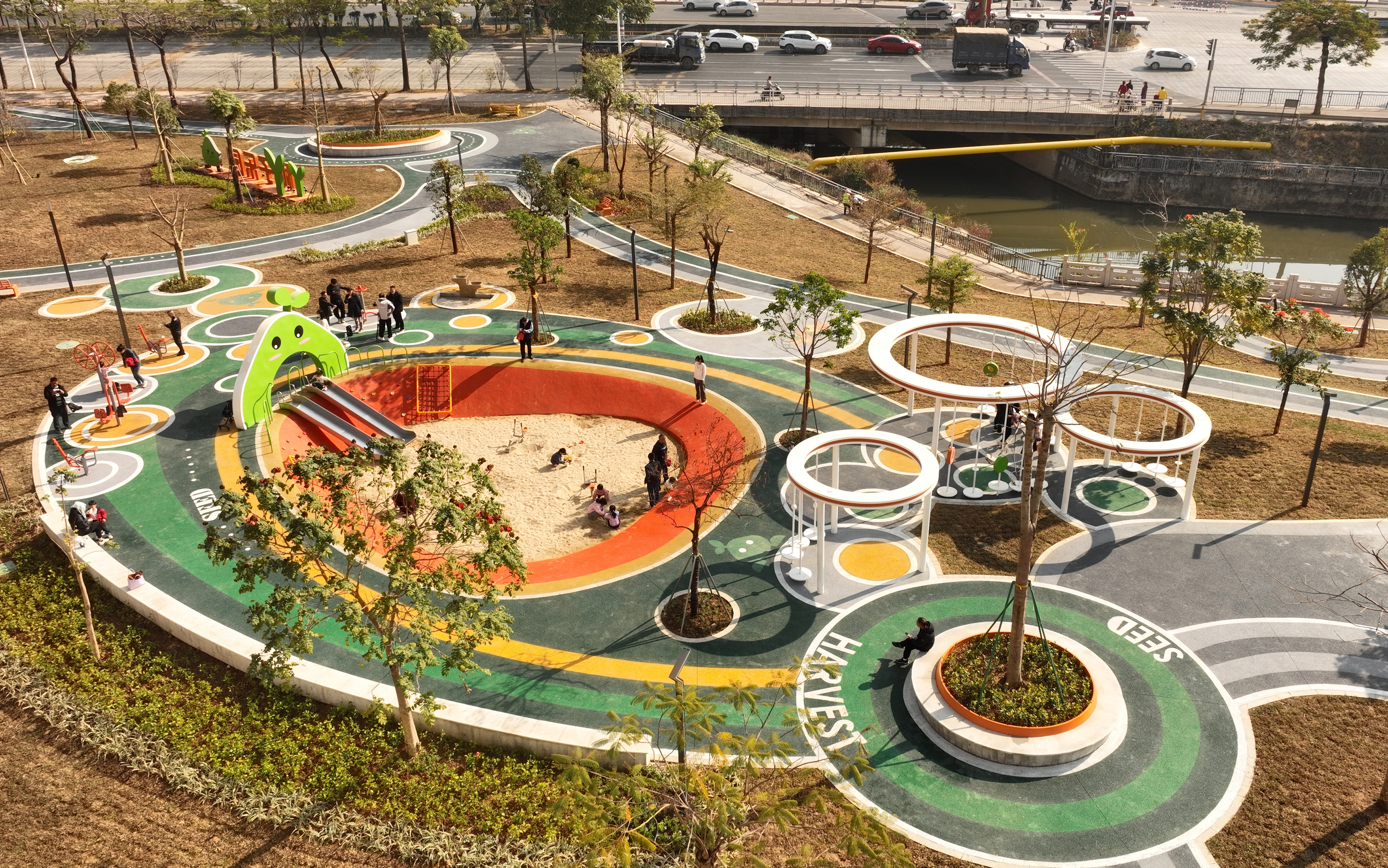 位于水口街道中心小學(xué)北側(cè)的口袋公園——種子樂園,是以“植物種子”為主題來打造的特色園。園內(nèi)有一片以綠色為主基調(diào)的橢圓形地板,仿佛一顆偌大的種子,中間包裹著一個超大的沙池,孩子們可以在園中盡情地撒歡,大人們則可以悠閑地散步。種子樂園面積約6800平方米,因方圓500米范圍內(nèi)有多所小學(xué)、幼兒園,該園結(jié)合實際打造成為了以兒童友好型街區(qū)為代表的特色口袋公園。