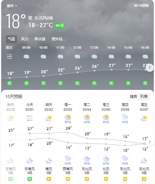 據(jù)惠州市氣象臺預(yù)計,3月1日-3日白天我市天氣暖濕,早晚有(輕)霧,各地伴有不同程度的“回南天”,最低氣溫17~21℃,最高氣溫26~28℃;3日傍晚-4日,受冷空氣影響我市有一次降溫降雨過程,北部有中到大雨局部暴雨,中南部有小到中雨,局地伴有雷電和6~8級短時大風(fēng)等強對流天氣,氣溫14~19℃;5日,陰天,有小雨局部中雨,氣溫13~18℃。