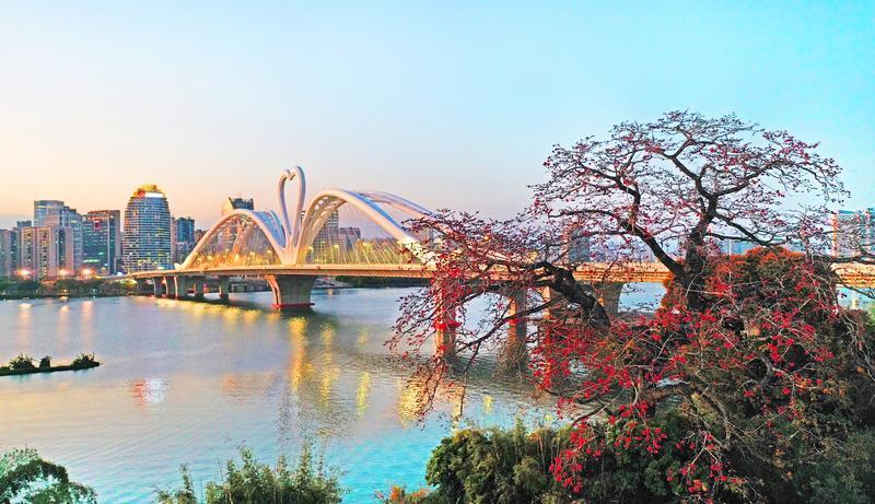 鵝城大橋下游南岸,有棵320多年樹(shù)齡的木棉樹(shù),高大挺拔。它的枝頭掛滿(mǎn)花蕾,三分之一的花朵已然綻放。木棉樹(shù)與鵝城大橋相互映襯,古樸與明艷交織,構(gòu)成一幅絕美春景圖,引得路人紛紛駐足欣賞。