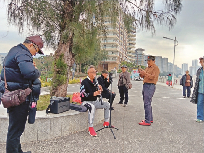 當海風拂過惠東巽寮灣的海岸線時,來自重慶的艾民正在漁業(yè)村雙魚島廣場吹奏薩克斯,這是他第二年到惠州濱海旅居過冬,每次都要待上幾個月。