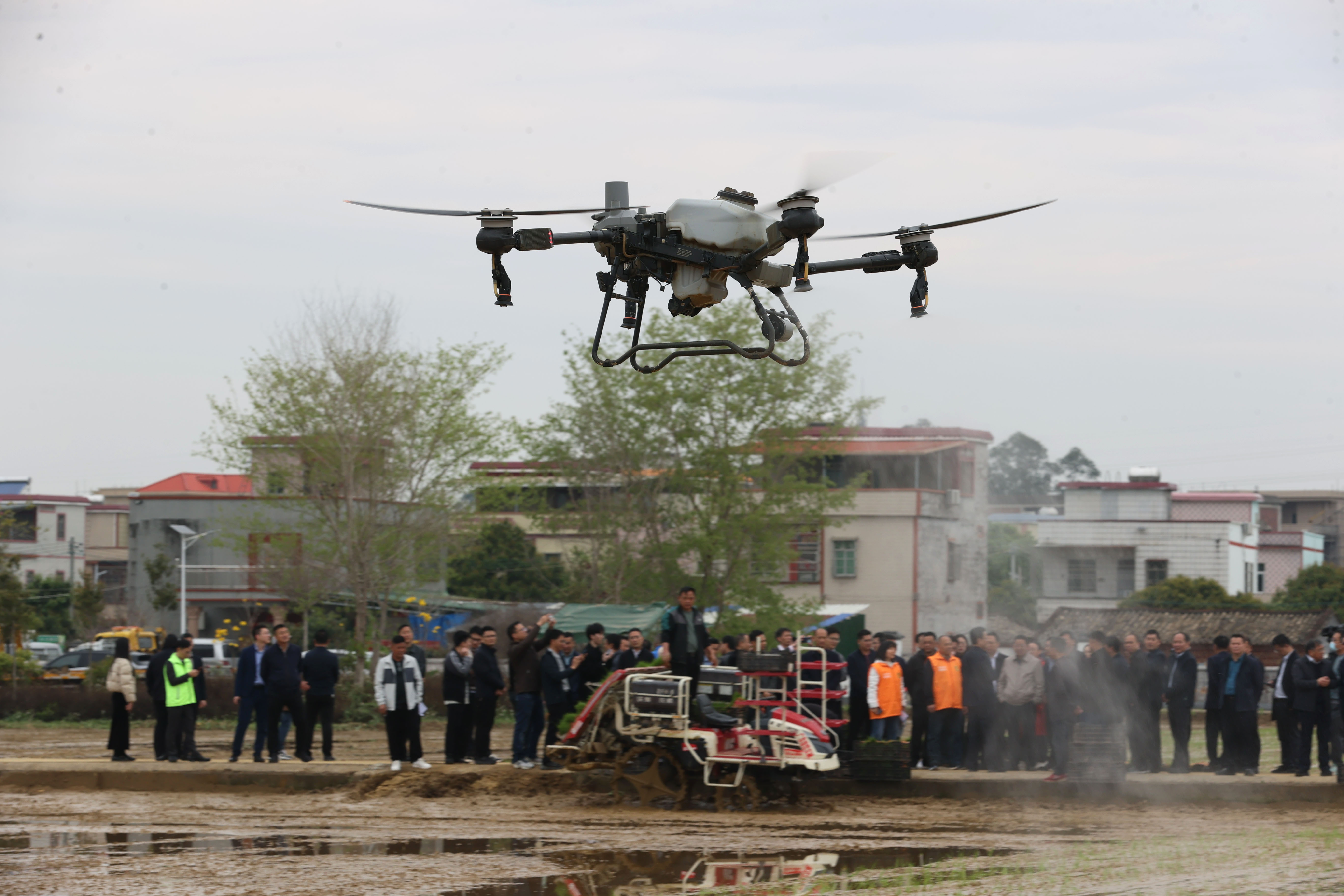 水稻穴直播機(jī)精準(zhǔn)地將稻種播撒在田間,無人機(jī)在空中靈活穿梭噴施藥肥……在專業(yè)農(nóng)機(jī)手的駕駛和操控下,博羅縣麻陂鎮(zhèn)洪湖村內(nèi)的大片水田很快便完成春耕播種任務(wù),高效又便捷。