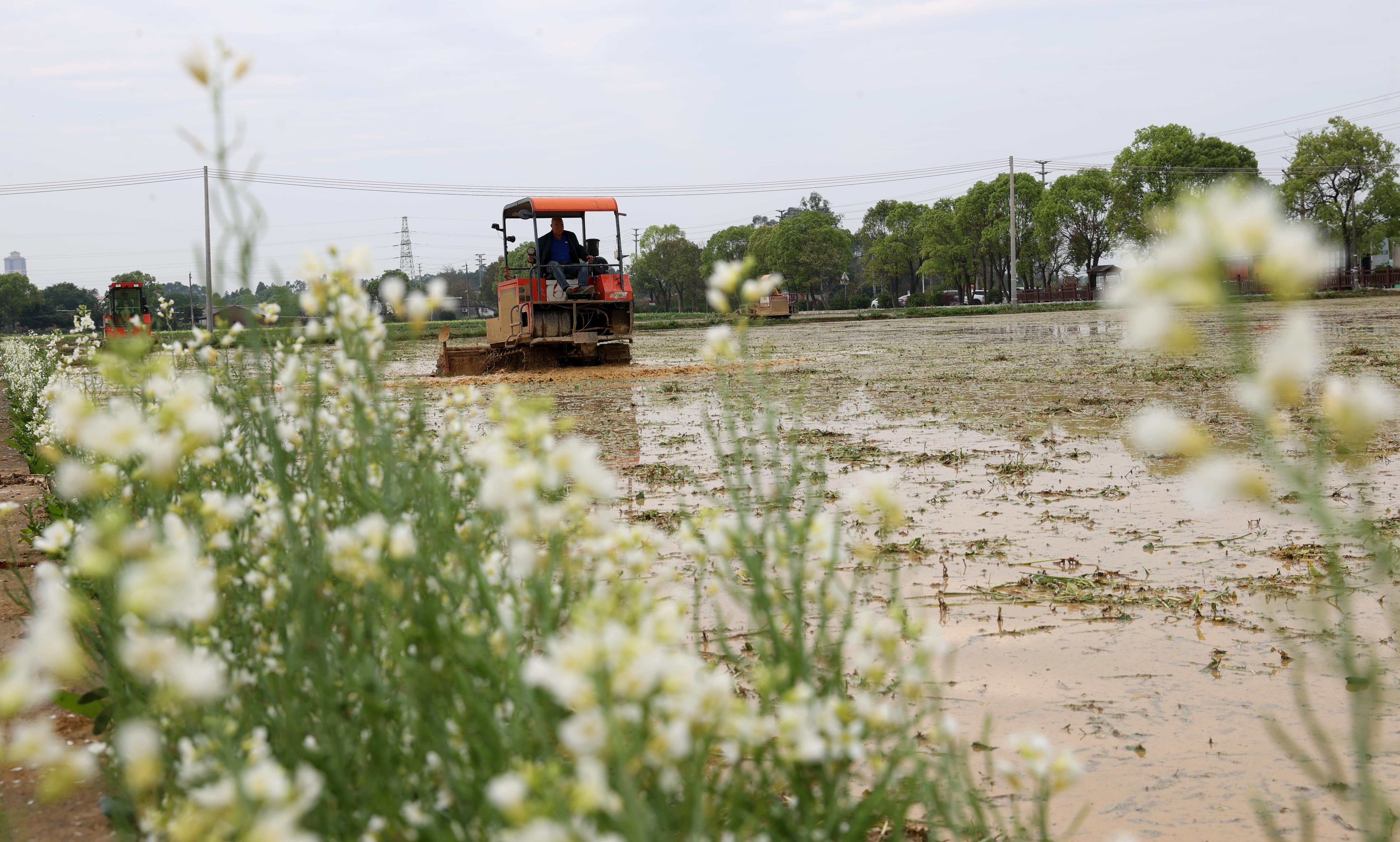 博羅縣麻陂鎮(zhèn)洪湖村,數(shù)臺(tái)拖拉機(jī)在打田。