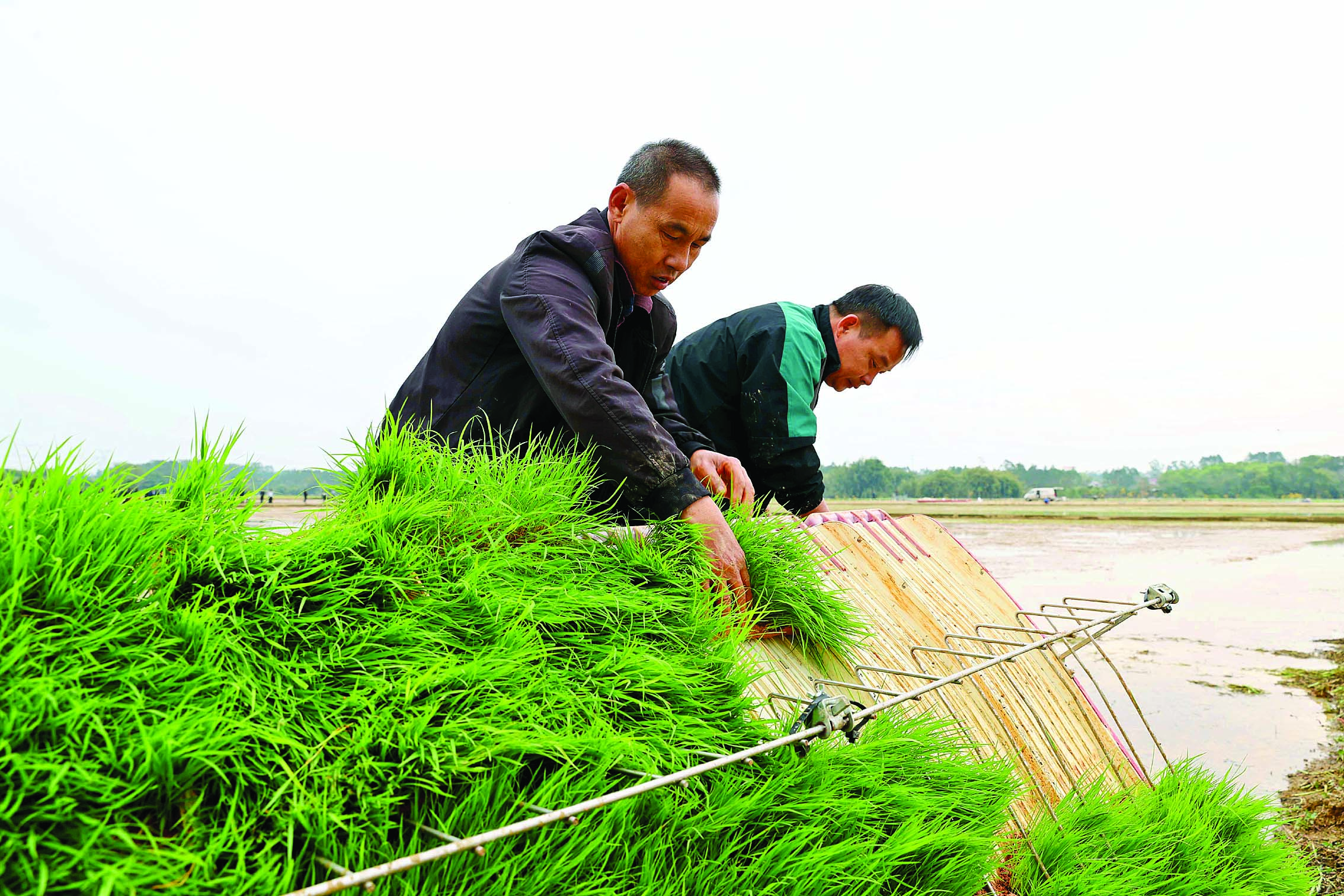 村民為插秧機(jī)裝上秧苗。