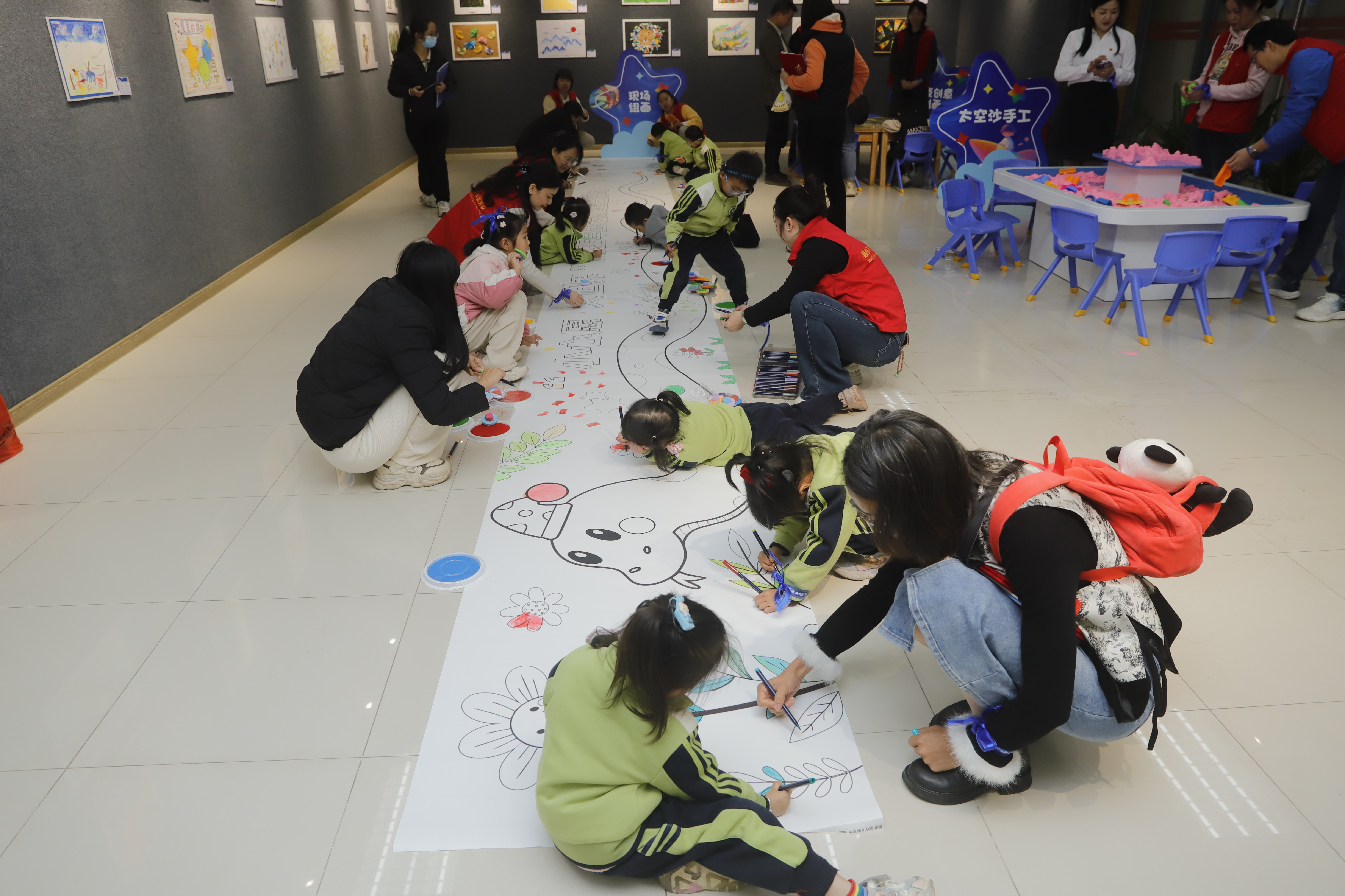 孤獨癥兒童、家長及社會人士共同參與“十米長卷 閃耀星空”組畫創(chuàng)作。惠州日報記者駱國紅 攝
