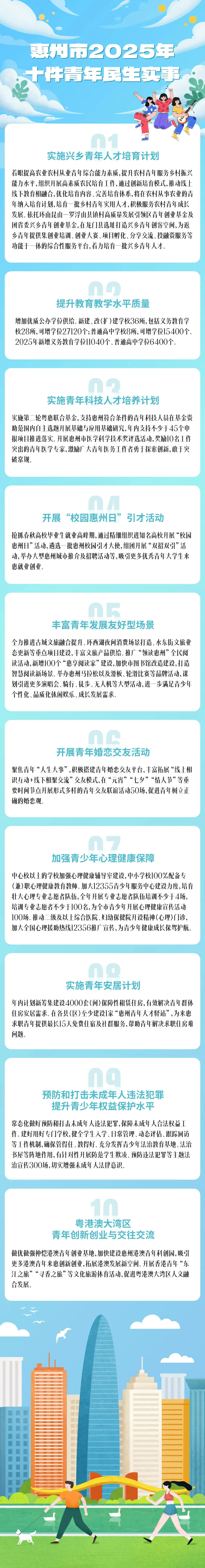惠州市2025年青年民生實事立足黨政所需、青年所盼,以服務(wù)中心大局、促進青年發(fā)展為落腳點起草,共分8大類10小項重點項目,其中涉及青年教育2項、青年就業(yè)和創(chuàng)新創(chuàng)業(yè)2項,青年健康、文化、婚戀、社會保障、權(quán)益與預(yù)防犯罪、社會融入與社會參與各1項。