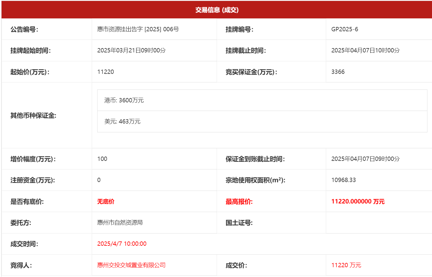 此次摘牌的惠州交投交城置業(yè)有限公司成立于2023年,是惠州交投利臻置業(yè)有限公司100%控股的子公司;葜萁煌豆倬W(wǎng)顯示,惠州交投利臻公司是惠州交投集團(tuán)核心二級企業(yè)之一。