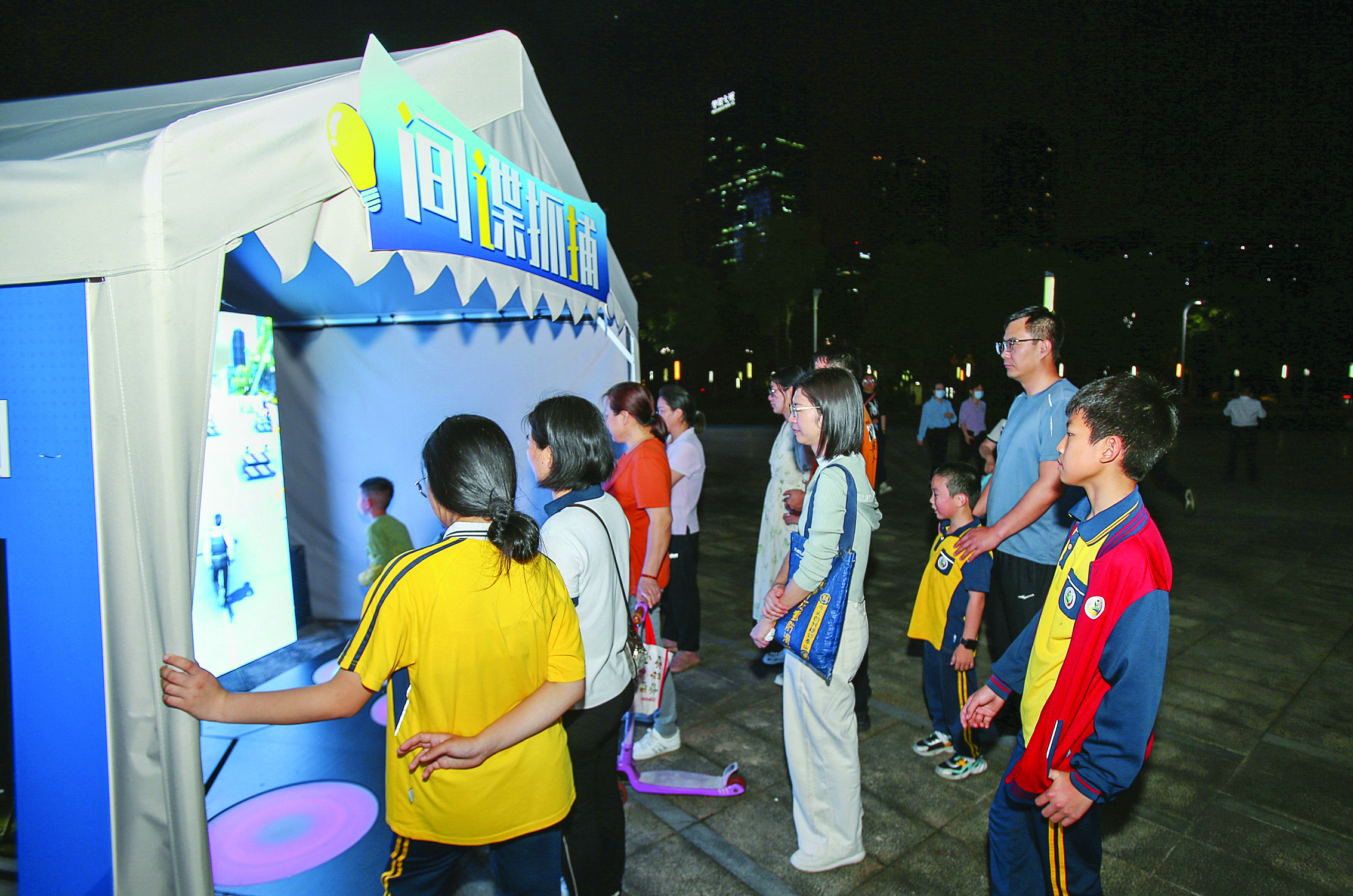 11日晚7時許,主題燈光展亮燈儀式在主會場市民公園啟動,活動現(xiàn)場變成一片科技藝術的海洋,總體國家安全觀主題展板、結合光影互動的特色打卡裝置、裸眼三維視頻內容展示……一幅幅極具沖擊力的炫彩畫面,成為廣大市民的主要打卡點;顒蝇F(xiàn)場結合互動裝置體驗“零號任務”、“間諜抓捕”、AI換臉、AI互動拍照等游戲環(huán)節(jié),以市民喜聞樂見的形式將國家安全相關知識有機融入,讓國家安全變得可感可傳。