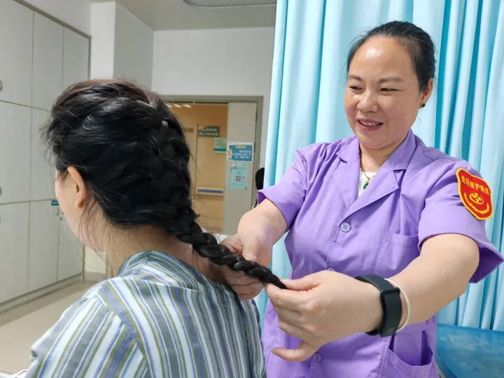 護理員在閑暇之時給患者梳辮子,讓患者心情更好。