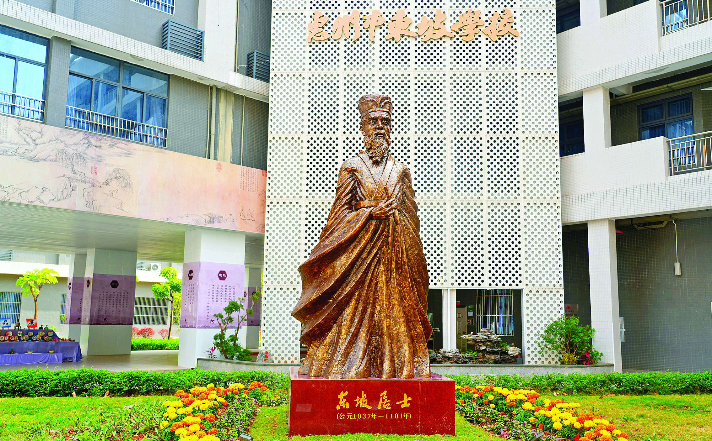 講座開始前,市東坡學(xué)校東坡居士塑像揭幕,為校園增添新的文化地標(biāo),該塑像由惠州市泥塑協(xié)會會長王云鵬創(chuàng)作。據(jù)悉,市東坡學(xué)校是惠州唯一一所以“東坡”命名的學(xué)校。該校積極弘揚東坡文化、傳承東坡精神,在校園設(shè)置“東坡文化長廊”“喚魚池”,述說東坡故事;在課堂中,學(xué)生誦讀東坡詩文,讓經(jīng)典浸潤課堂;舉辦“東坡書畫展”“東坡愛心集市”等活動。