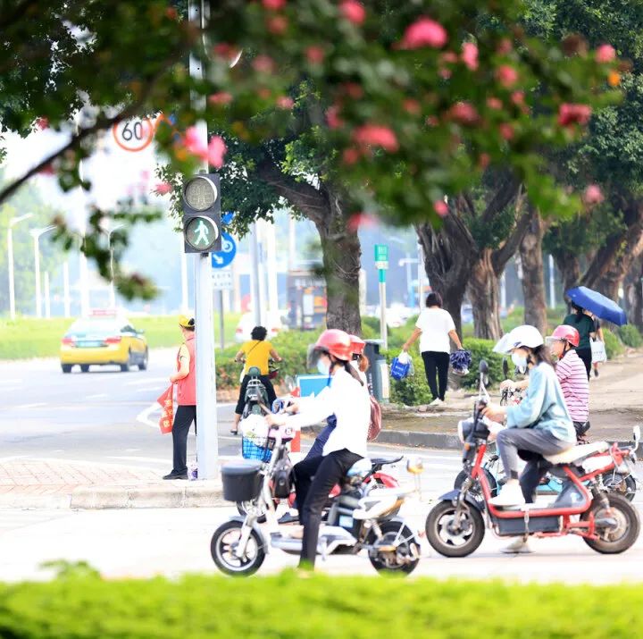 大部分市民佩戴安全頭盔文明出行。