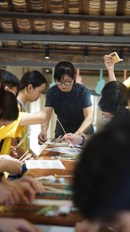 竹編傳承人陳師傅的指尖正翻飛著篾條,七八個(gè)孩子有樣學(xué)樣,將浸泡過的竹片編成小船燈骨架。