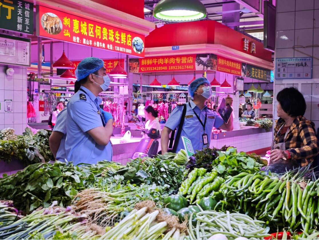 惠州市市場(chǎng)監(jiān)督管理局工作人員在烏石綜合市場(chǎng)的蔬菜檔口進(jìn)行抽檢食品取樣。