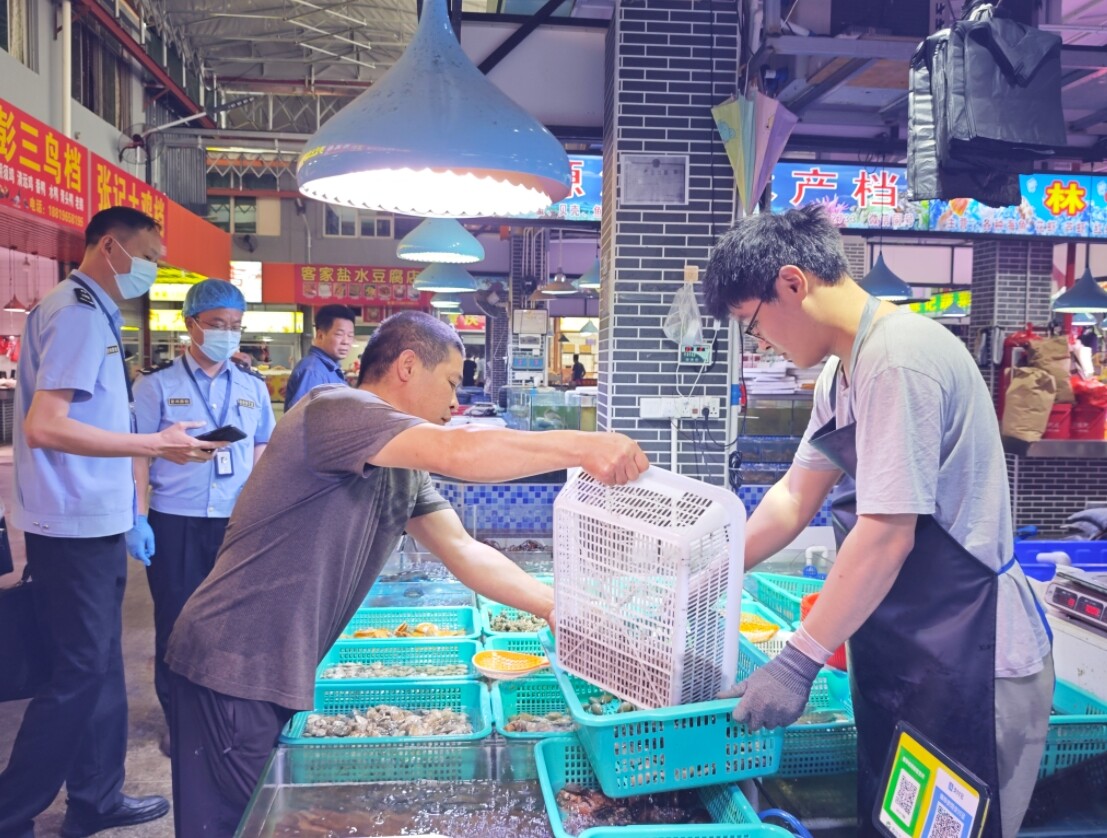 惠州市市場(chǎng)監(jiān)督管理局工作人員在烏石綜合市場(chǎng)的水產(chǎn)檔口進(jìn)行抽檢食品取樣。