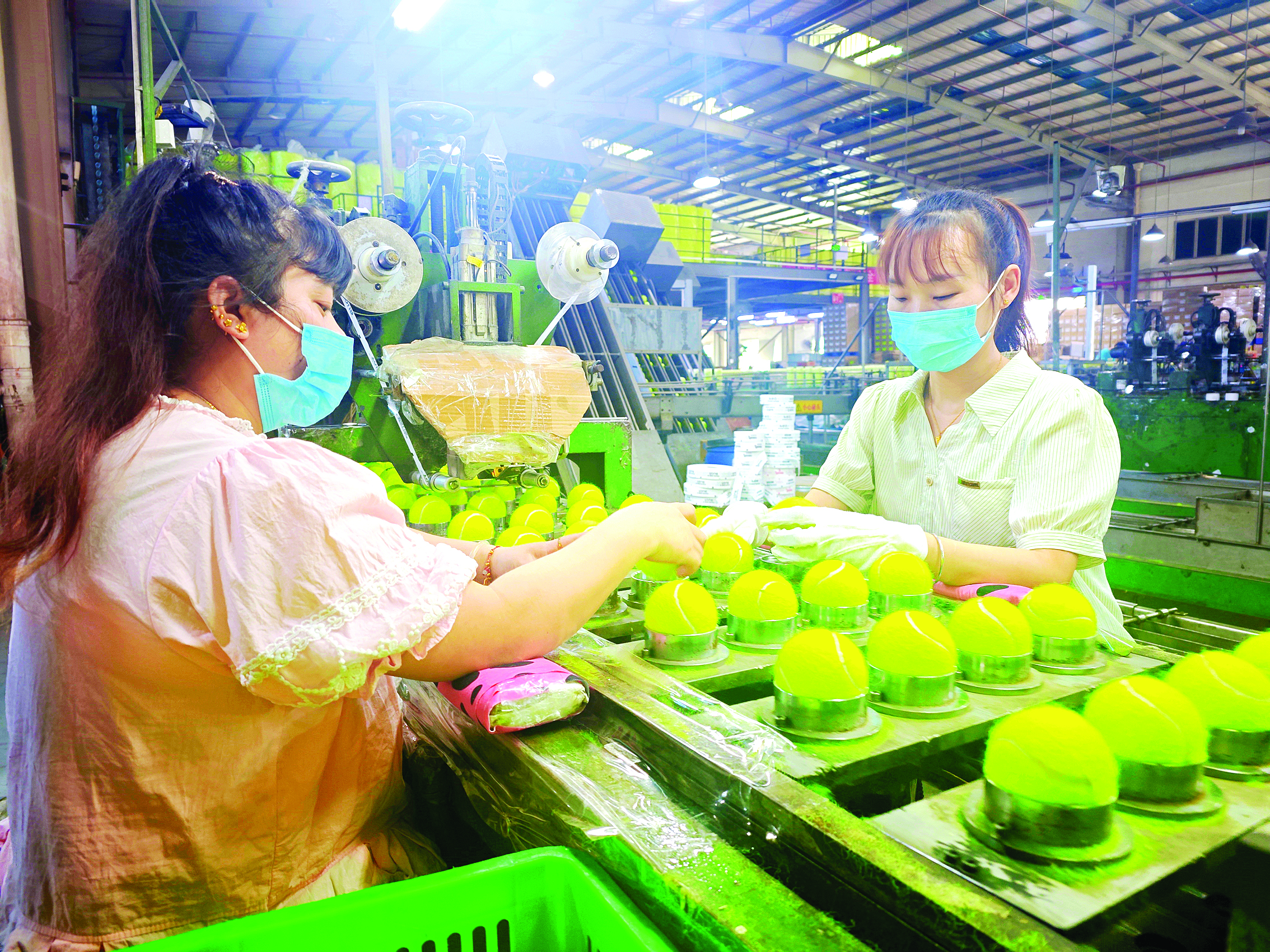 海德運動器材(惠州)有限公司工作人員在檢測成品球。
