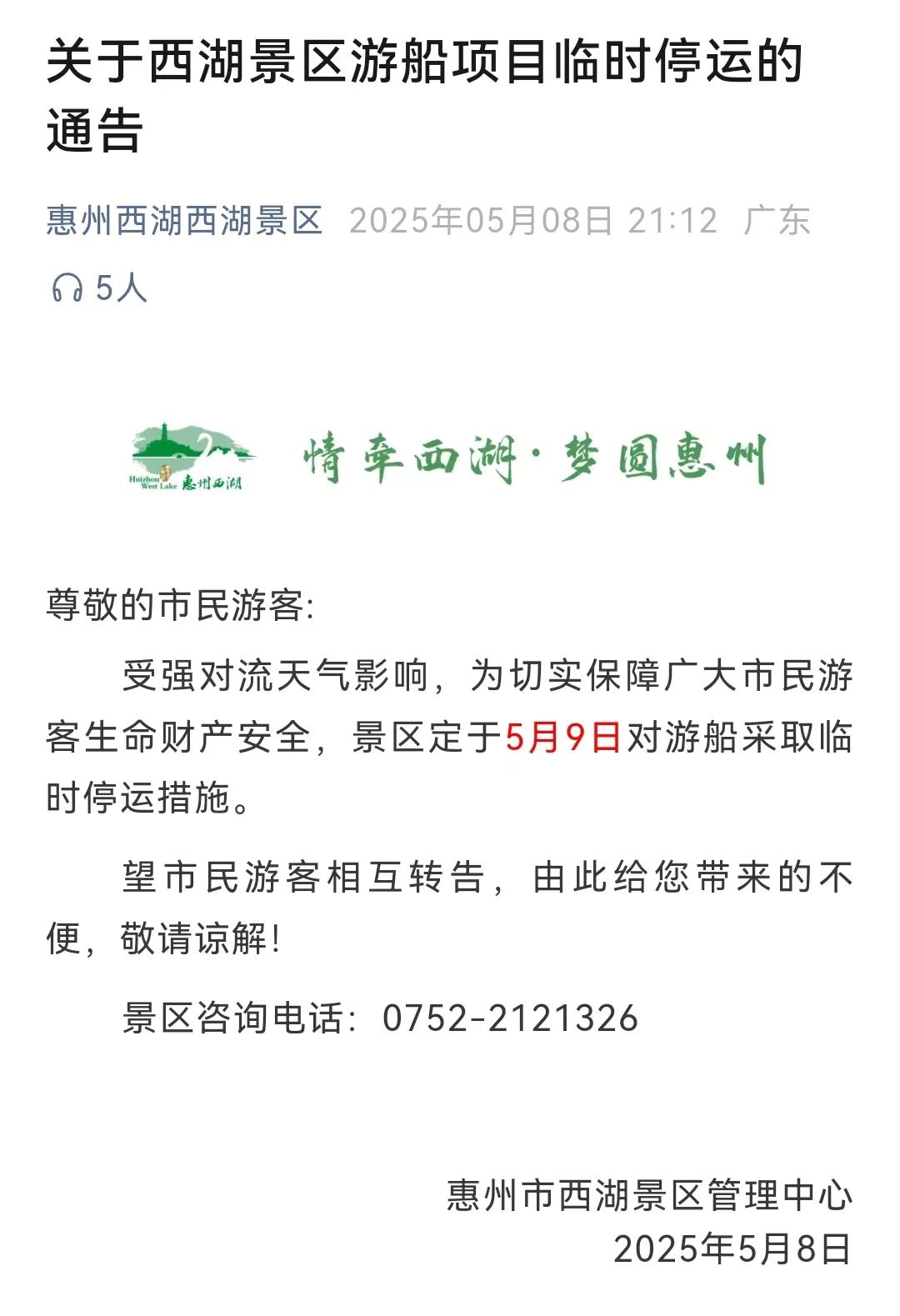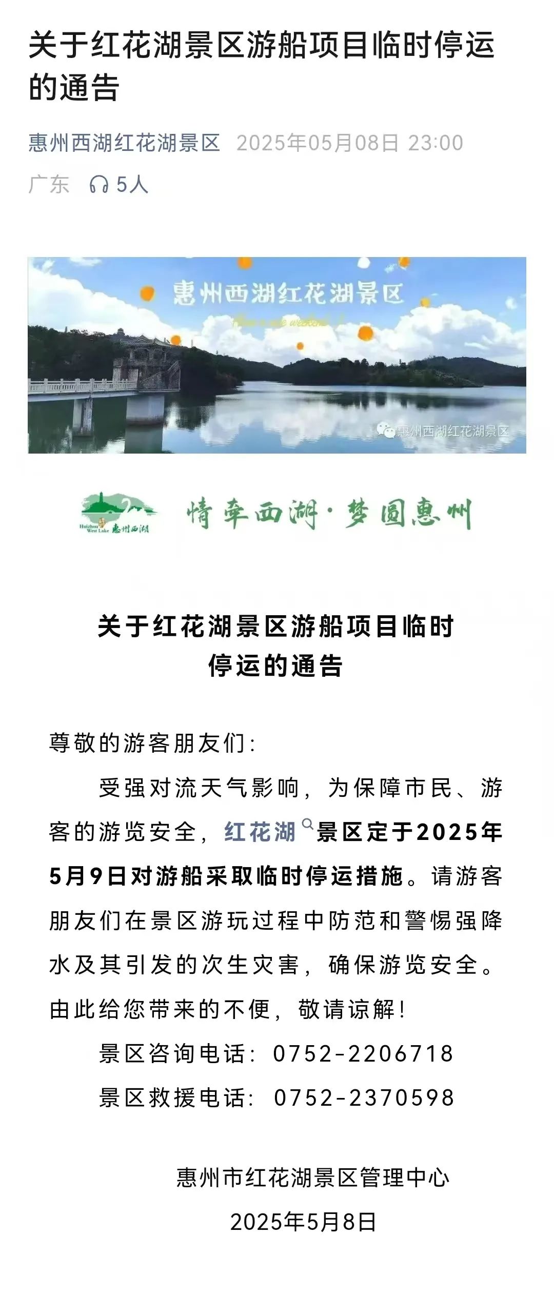 各位市民游客注意!受強對流天氣影響惠州西湖景區(qū)、紅花湖景區(qū)5月8日晚分別發(fā)布通告定于5月9日對景區(qū)游船項目臨時停運。