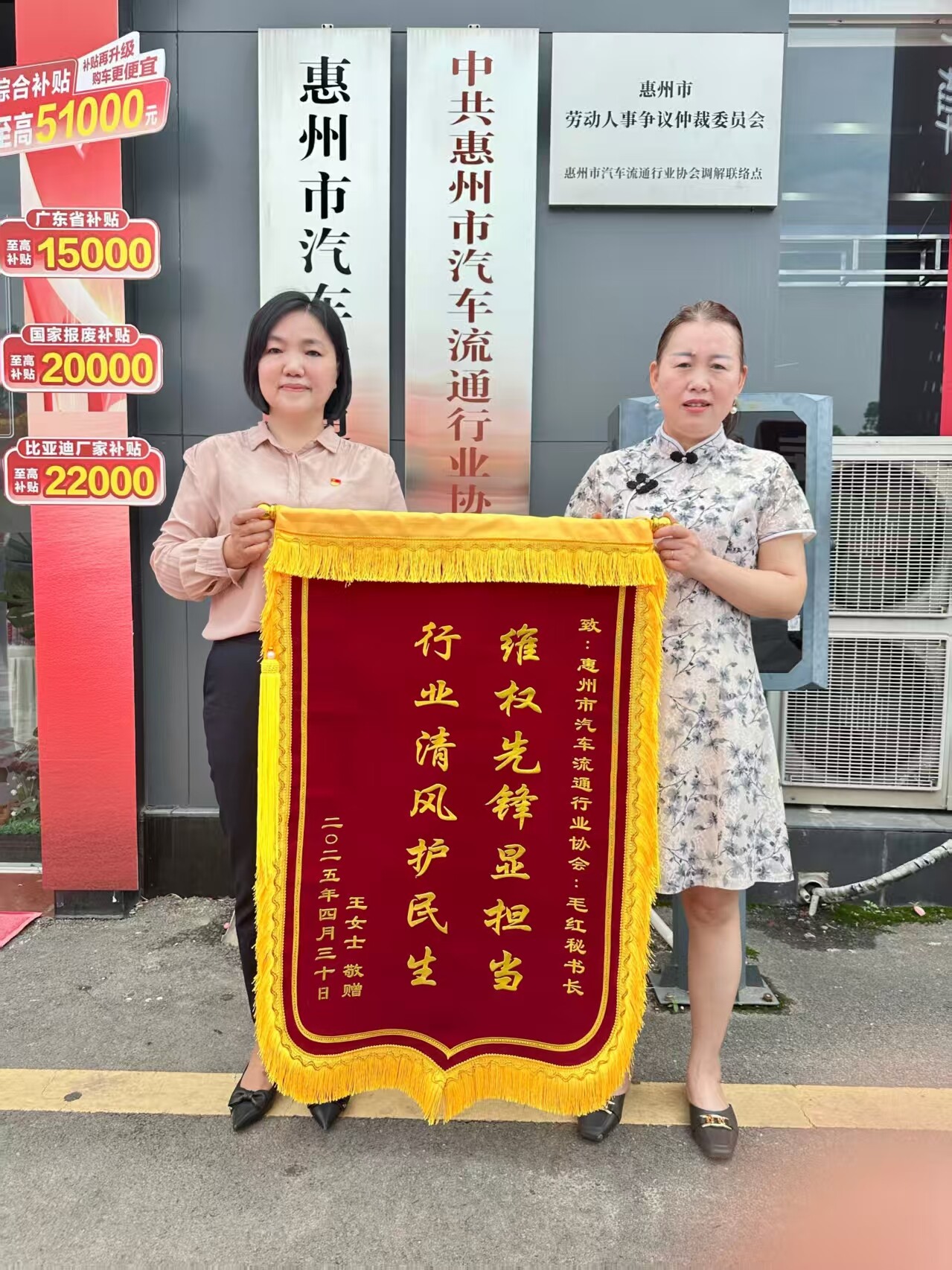 近日,王女士將一面寫著“維權(quán)先鋒顯擔(dān)當(dāng) 行業(yè)清風(fēng)護(hù)民生”的錦旗送到惠州市汽車流通行業(yè)協(xié)會,對該協(xié)會高效公正處理消費(fèi)投訴表示感謝。