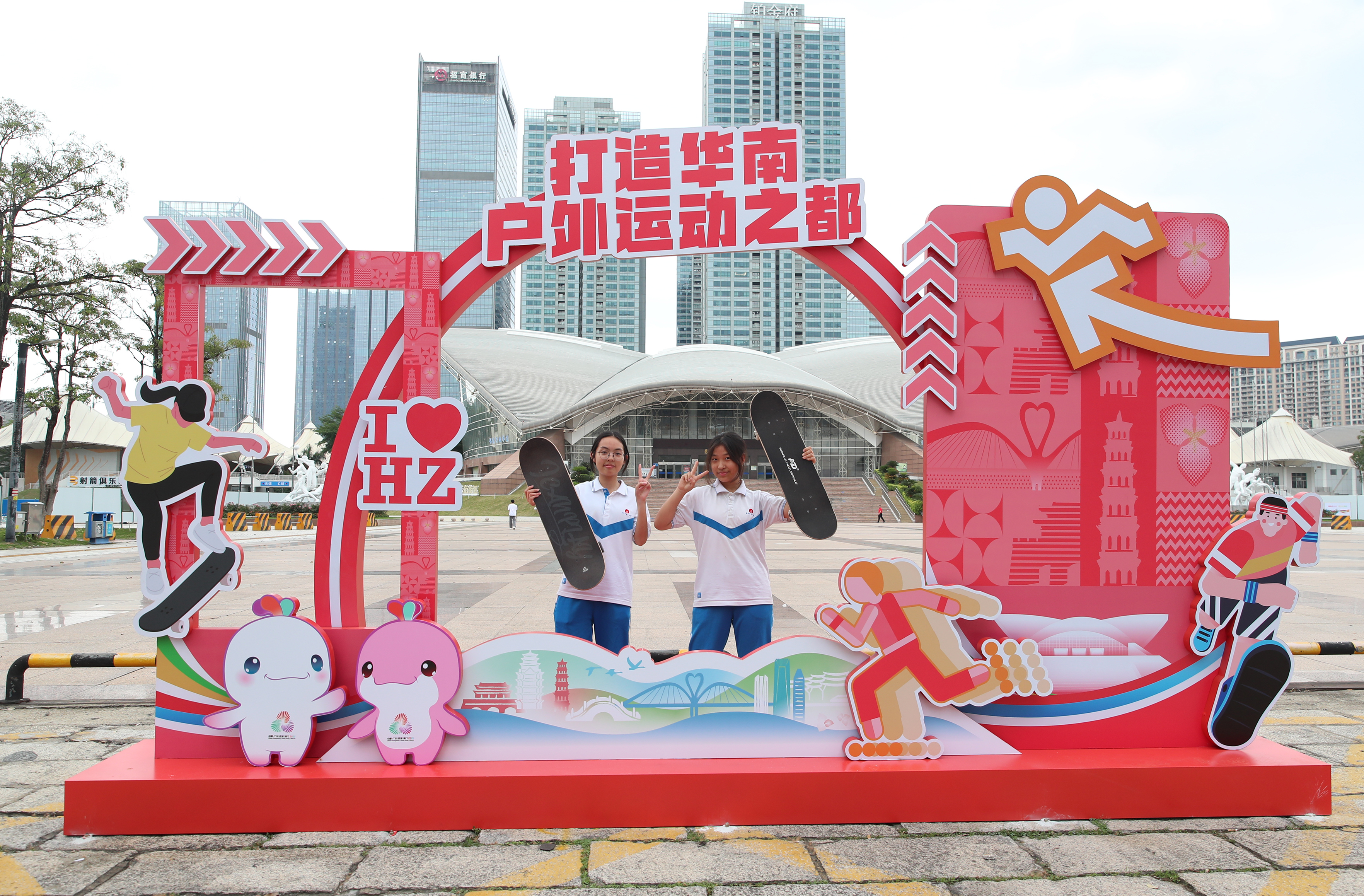 滑板愛好者在惠州體育館廣場打卡點(diǎn)拍照;葜萑請(bào)記者鐘暢新 攝