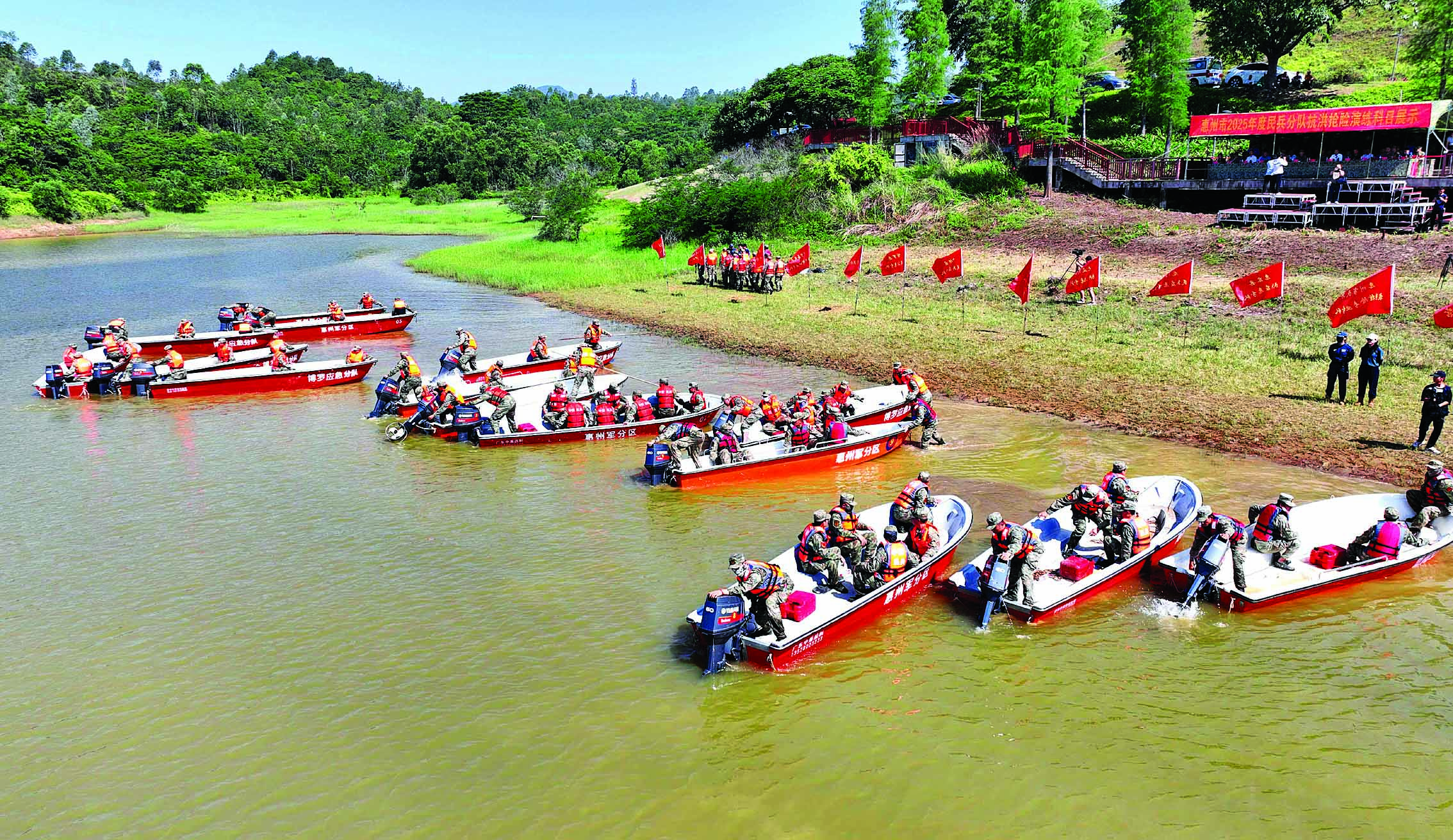 5月13日,在惠城區(qū)角洞水庫某水域,隨著現(xiàn)場指揮員一聲令下,惠州市2025年度民兵分隊抗洪搶險演練隨即拉開戰(zhàn)幕。來自各縣(區(qū))百余名民兵應(yīng)急分隊抗洪搶險專業(yè)骨干劈波斬浪、同臺競技,全方位全領(lǐng)域檢驗了全市民兵應(yīng)急分隊骨干組指揮、裝備使用和處置復(fù)雜險情能力。