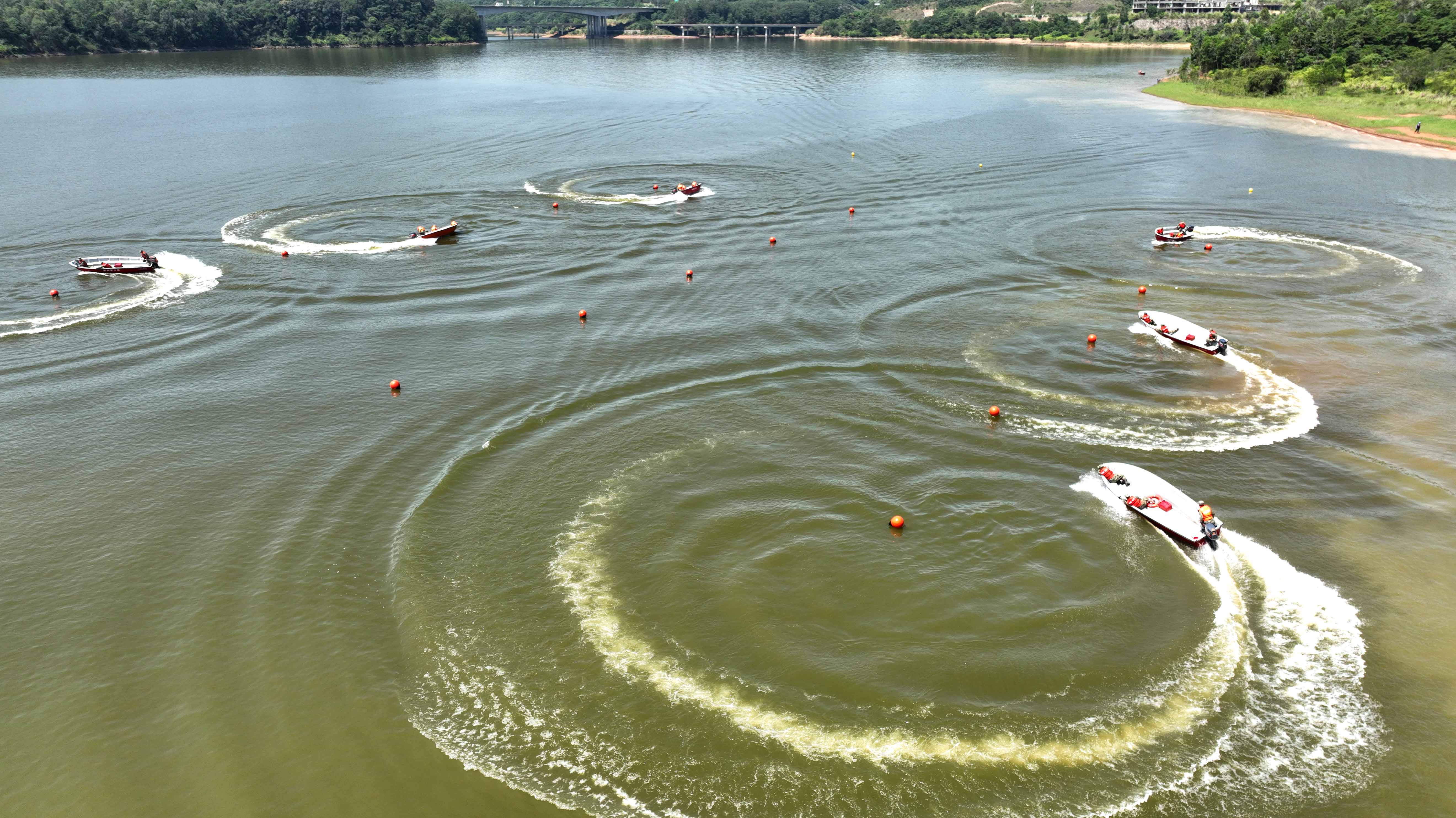在水面過障環(huán)節(jié),操作手俯身駕駛沖鋒舟,一次又一次快速通過門字型障礙物,既使人捏了一把汗,又讓人忍不住暗自叫好;協(xié)同搜救是在無人機起飛后1分鐘,沖鋒舟即出發(fā)抵達指定救援區(qū)域,然后再由無人機搜索目標,并引導(dǎo)沖鋒舟隊員上岸轉(zhuǎn)移目標。