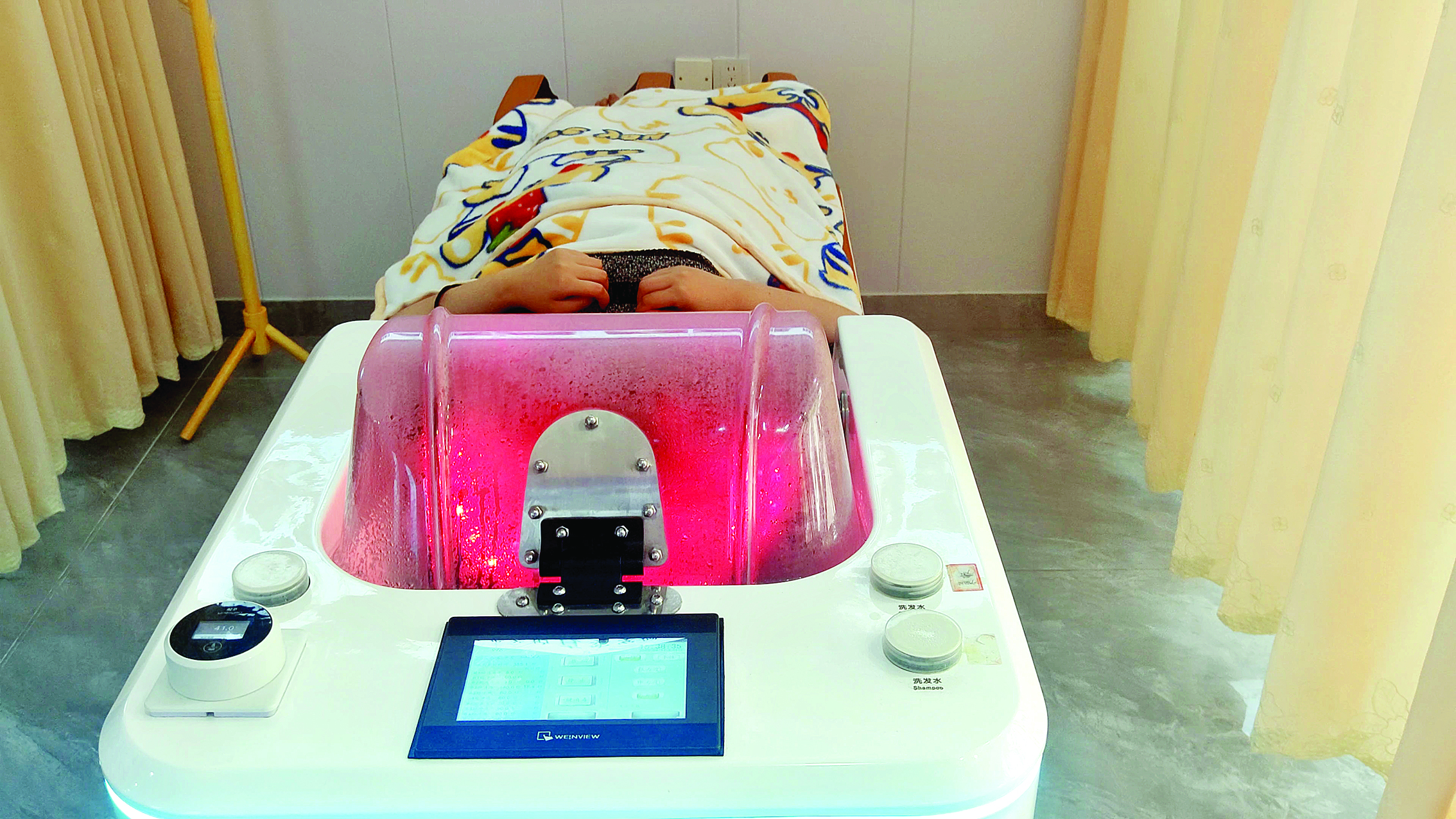 檢測(cè)完成后,店員根據(jù)顧客頭皮、發(fā)質(zhì)情況,啟動(dòng)AI洗頭設(shè)備。記者面前的AI洗頭機(jī)器集身體按摩和頭部自動(dòng)洗頭于一體,店員在操作面板前選擇需要的服務(wù)類型,為顧客遞上一次性耳塞,調(diào)節(jié)好合適的水溫水壓后就開始AI自動(dòng)洗頭。顧客可選擇速洗、普通、加時(shí)、淋水或養(yǎng)護(hù)等模式,力度有低、中、高三檔,還能根據(jù)頭發(fā)長(zhǎng)度選擇長(zhǎng)發(fā)或短發(fā)模式。洗頭過(guò)程中,機(jī)器內(nèi)部有一個(gè)淋浴器循環(huán)擺動(dòng)不斷調(diào)節(jié)方位,并通過(guò)紅外線燈精準(zhǔn)輸送水流,調(diào)節(jié)力度和溫度,實(shí)現(xiàn)全方位沖灑、清潔頭皮,“一共七次沖洗,主要通過(guò)水的脈沖來(lái)達(dá)到清洗頭部的效果,設(shè)備還設(shè)有按摩床,一邊洗頭,一邊對(duì)顧客進(jìn)行身體按摩,整個(gè)洗頭流程大約15分鐘!钡陠T介紹。