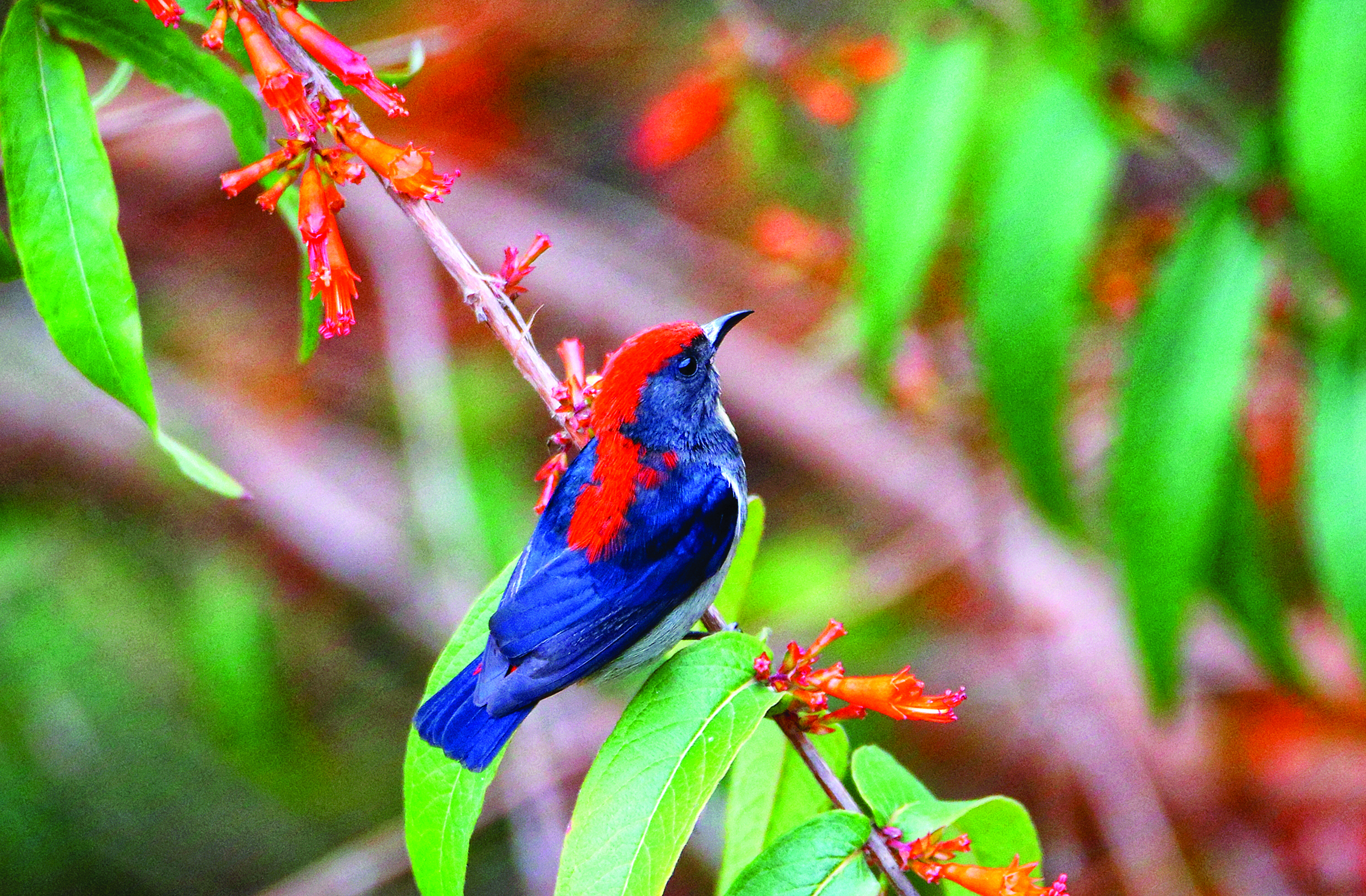 5月的惠州植物園,澄澈的湖面波光瀲滟,白鵝悠然游弋,岸邊樹木枝繁葉茂,橙紅與翠綠交織搖曳。一只朱背啄花鳥停歇枝頭,它頭頂艷紅似火,背部藍(lán)黑羽毛泛著幽幽光澤,腹部羽毛淺淡柔和,靈動(dòng)的眼睛與小巧的喙透著與生俱來的機(jī)敏!傍B友”們紛紛舉起相機(jī),定格下這珍貴的瞬間。