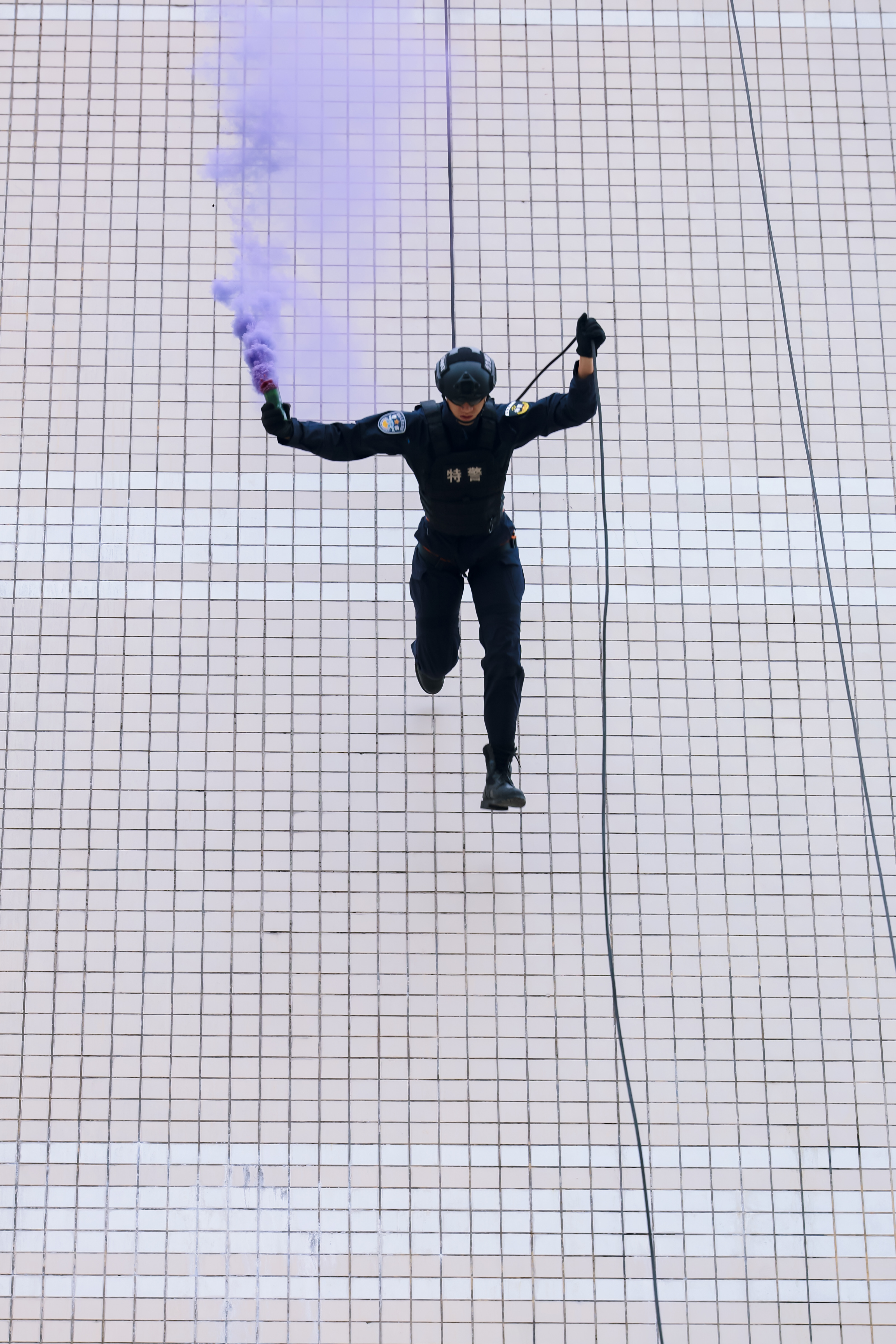 “特警索降”環(huán)節(jié)中,全副武裝的特警隊(duì)員從舞臺(tái)右上方高空速降,動(dòng)作干凈利落,只用短短幾秒即從數(shù)十米高空到達(dá)地面,觀眾爆發(fā)出陣陣喝彩聲。