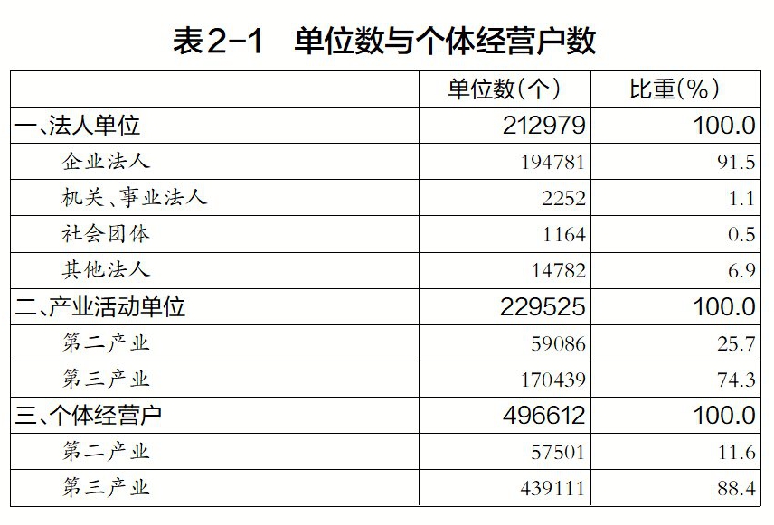 2023年末,全市共有從事第二產(chǎn)業(yè)和第三產(chǎn)業(yè)活動的法人單位212979個(gè),比2018年末增加98015個(gè),增長85.3%;產(chǎn)業(yè)活動單位[產(chǎn)業(yè)活動單位是法人單位的組成部分。僅包含一個(gè)產(chǎn)業(yè)活動單位的法人單位,稱為單產(chǎn)業(yè)法人單位,該法人單位同時(shí)也是一個(gè)產(chǎn)業(yè)活動單位;由兩個(gè)及以上產(chǎn)業(yè)活動單位組成的法人單位,稱為多產(chǎn)業(yè)法人單位。本公報(bào)中產(chǎn)業(yè)活動單位包括單產(chǎn)業(yè)法人單位和多產(chǎn)業(yè)法人單位下屬產(chǎn)業(yè)活動單位。]229525個(gè),增加101549個(gè),增長79.4%;個(gè)體經(jīng)營戶496612個(gè),增加157415個(gè),增長46.4%(詳見表2-1)。