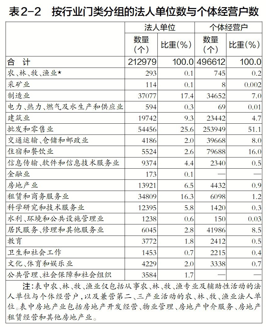 在第二產(chǎn)業(yè)和第三產(chǎn)業(yè)法人單位中,位居前三位的行業(yè)是:批發(fā)和零售業(yè)54456個(gè),占25.6%;制造業(yè)37077個(gè),占17.4%;租賃和商務(wù)服務(wù)業(yè)34809個(gè),占16.3%。在個(gè)體經(jīng)營戶中,位居前三位的行業(yè)是:批發(fā)和零售業(yè)253949個(gè),占51.1%;住宿和餐飲業(yè)79688個(gè),占16.0%;居民服務(wù)、修理和其他服務(wù)業(yè)41986個(gè),占8.5%(詳見表2-2)。