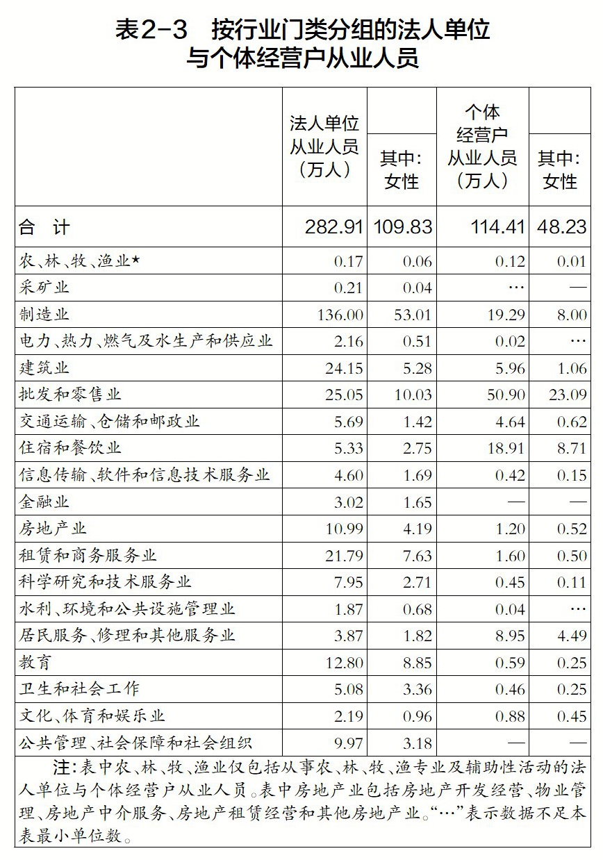 在第二產(chǎn)業(yè)和第三產(chǎn)業(yè)法人單位從業(yè)人員中,位居前三位的行業(yè)是:制造業(yè)136.0萬人,占48.1%;批發(fā)和零售業(yè)25.05萬人,占8.9%;建筑業(yè)24.15萬人,占8.5%。在個(gè)體經(jīng)營戶從業(yè)人員中,位居前三位的行業(yè)是:批發(fā)和零售業(yè)50.90萬人,占44.5%;制造業(yè)19.29萬人,占16.9%;住宿和餐飲業(yè)18.91萬人,占16.5%(詳見表2-3)。