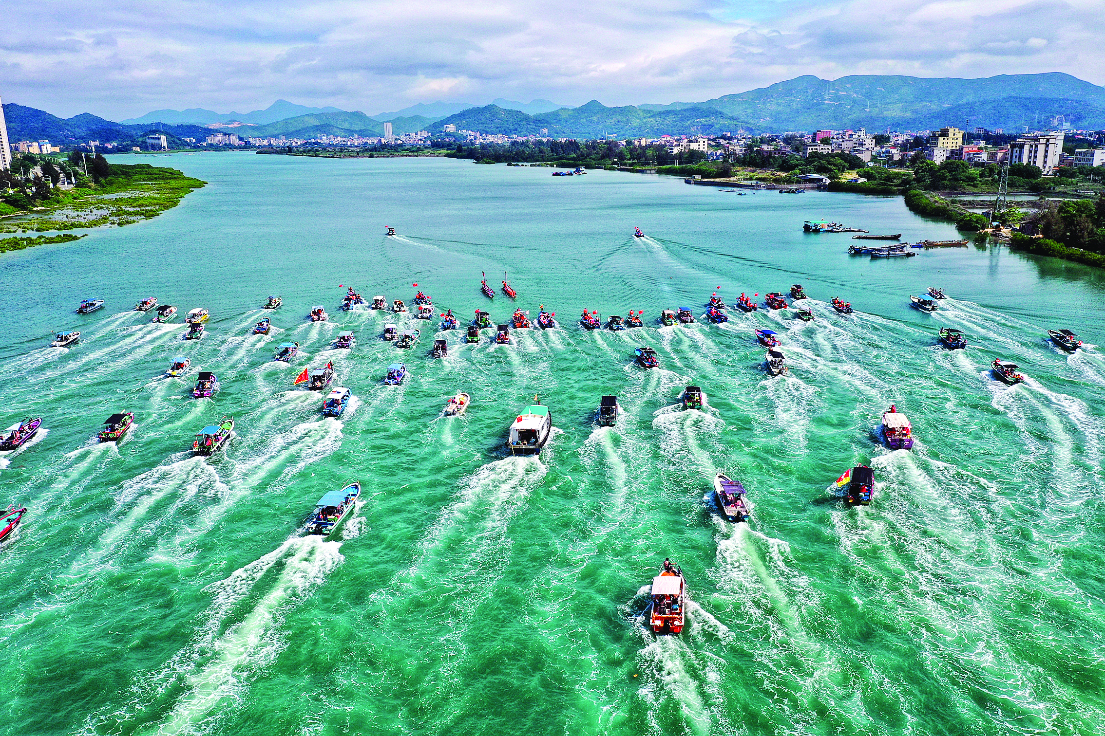 5月31日正是端午佳節(jié),惠東縣港口濱海旅游度假區(qū)內(nèi)灣,新村村龍舟賽熱鬧非凡。海面上,兩艘龍舟領(lǐng)銜,群舟如靈動(dòng)游魚競發(fā)。五彩船只或齊心劃槳,或疾馳破浪,年輕的村民們動(dòng)作整齊,盡顯團(tuán)隊(duì)激情與競渡的蓬勃生機(jī)。 惠州日?qǐng)?bào)記者朱金贊 攝