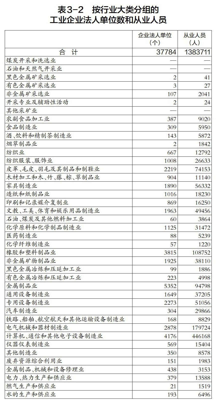 在工業(yè)企業(yè)法人單位中,采礦業(yè)114個(gè),制造業(yè)37077個(gè),電力、熱力、燃?xì)饧八a(chǎn)和供應(yīng)業(yè)593個(gè),分別占0.3%、98.1%和1.6%。在工業(yè)行業(yè)大類中,金屬制品業(yè)、計(jì)算機(jī)通信和其他電子設(shè)備制造業(yè)、橡膠和塑料制品業(yè)企業(yè)法人單位數(shù)位居前三位,分別占14.2%、11.1%和10.1%。