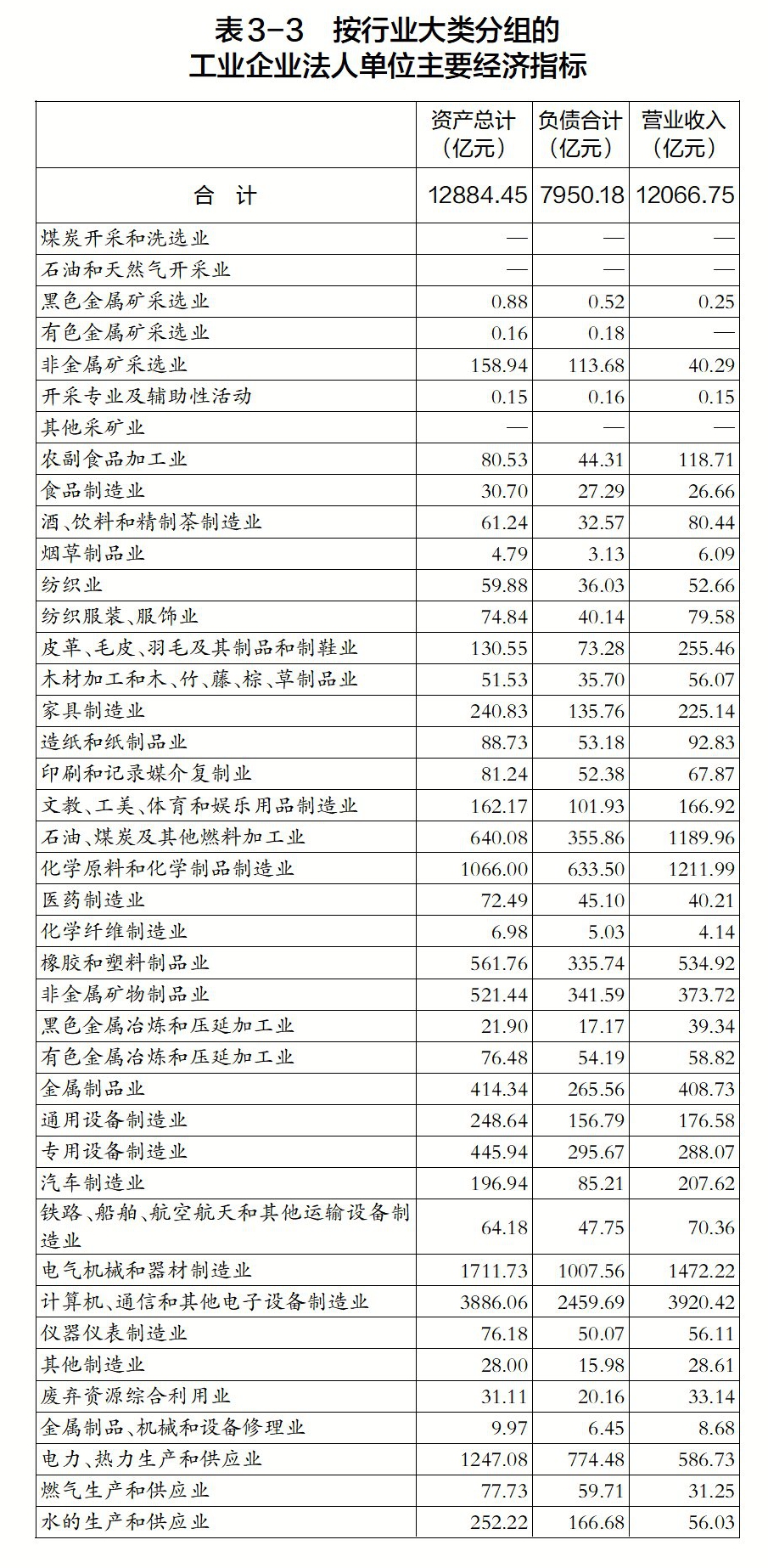 2023年,工業(yè)企業(yè)法人單位全年實(shí)現(xiàn)營業(yè)收入12066.75 億元,比2018年增長41.8%(詳見表3-3)。